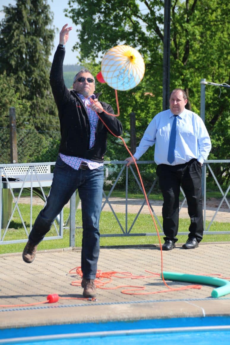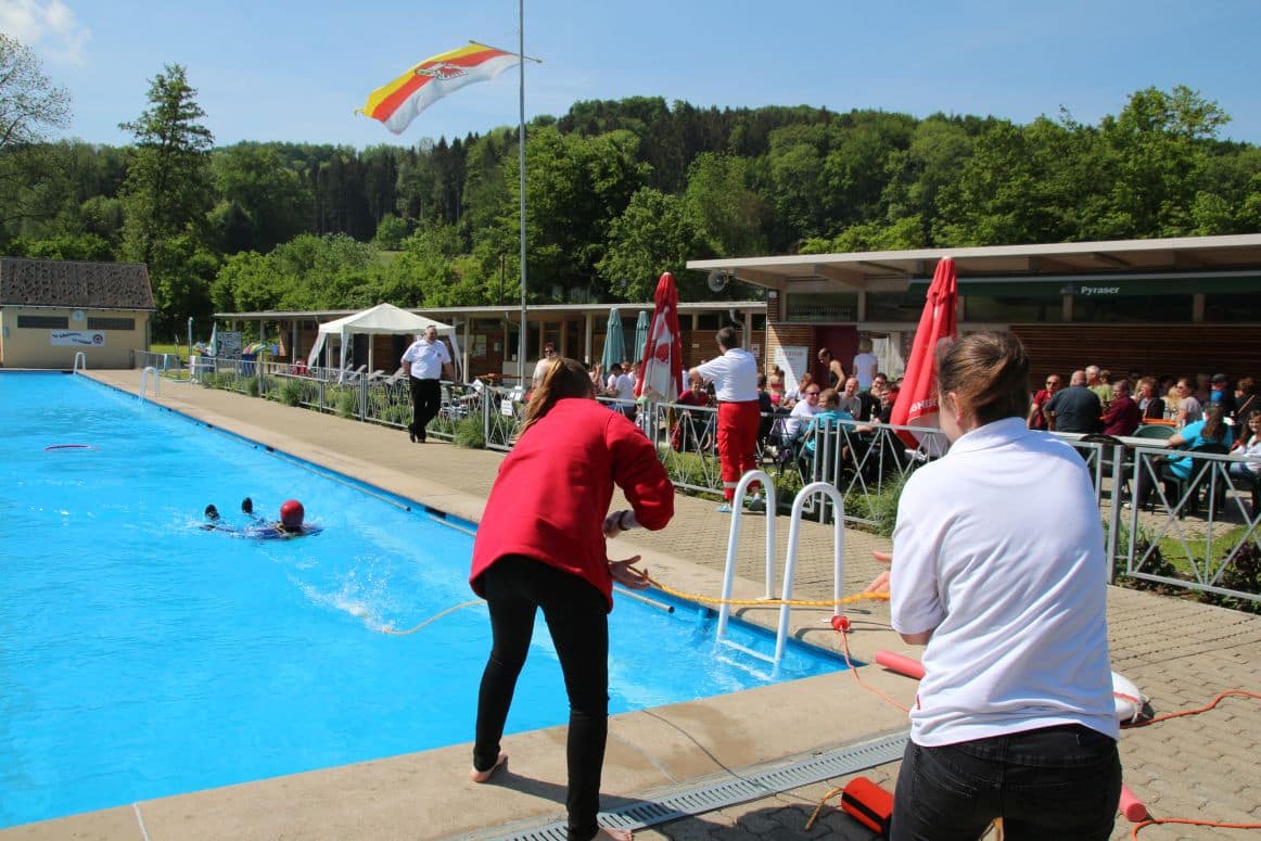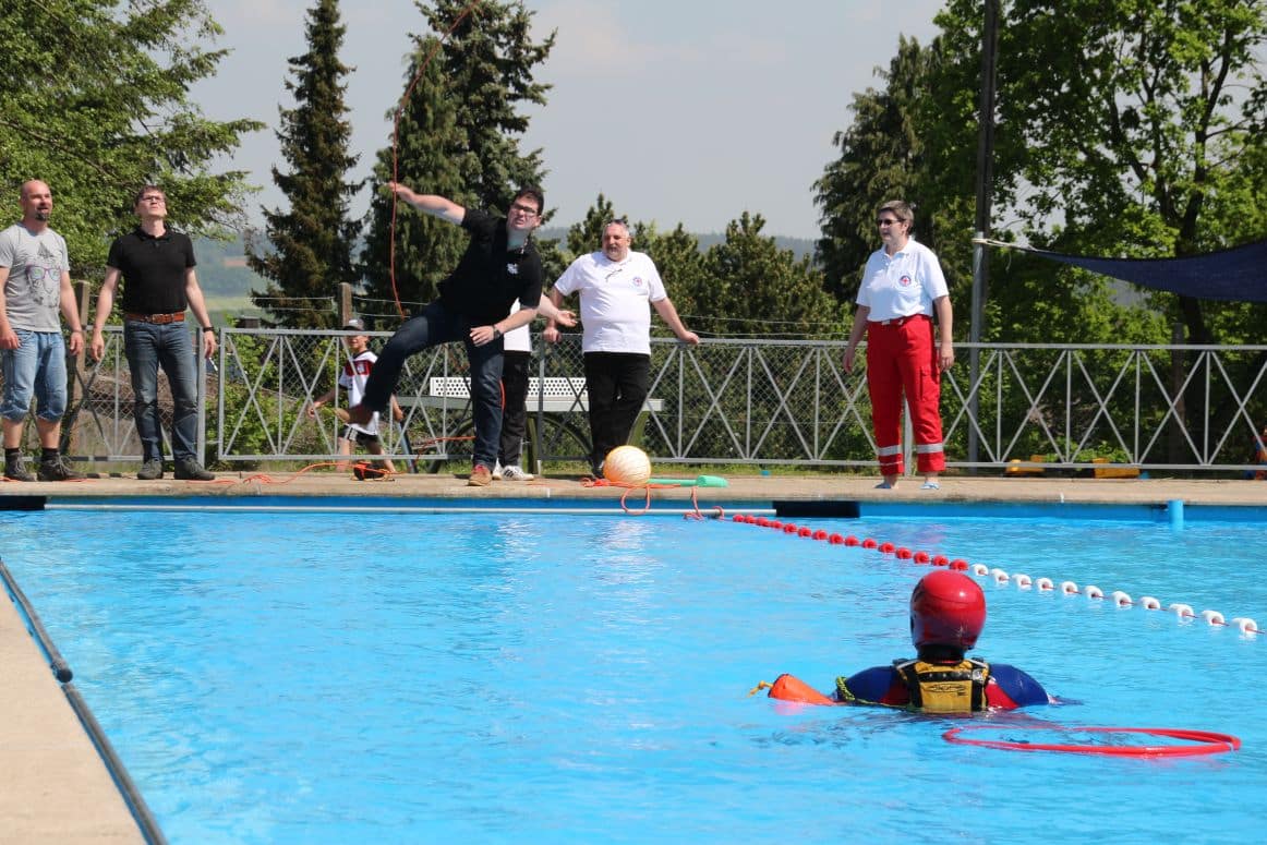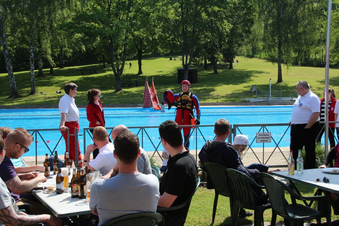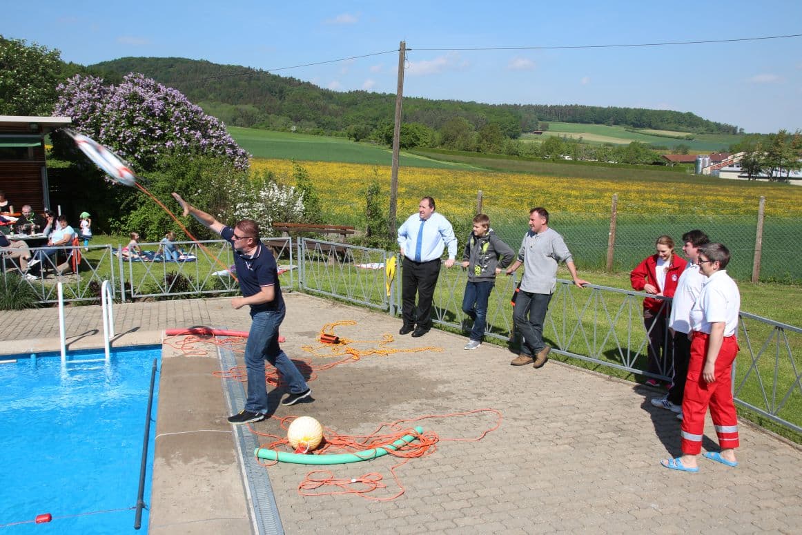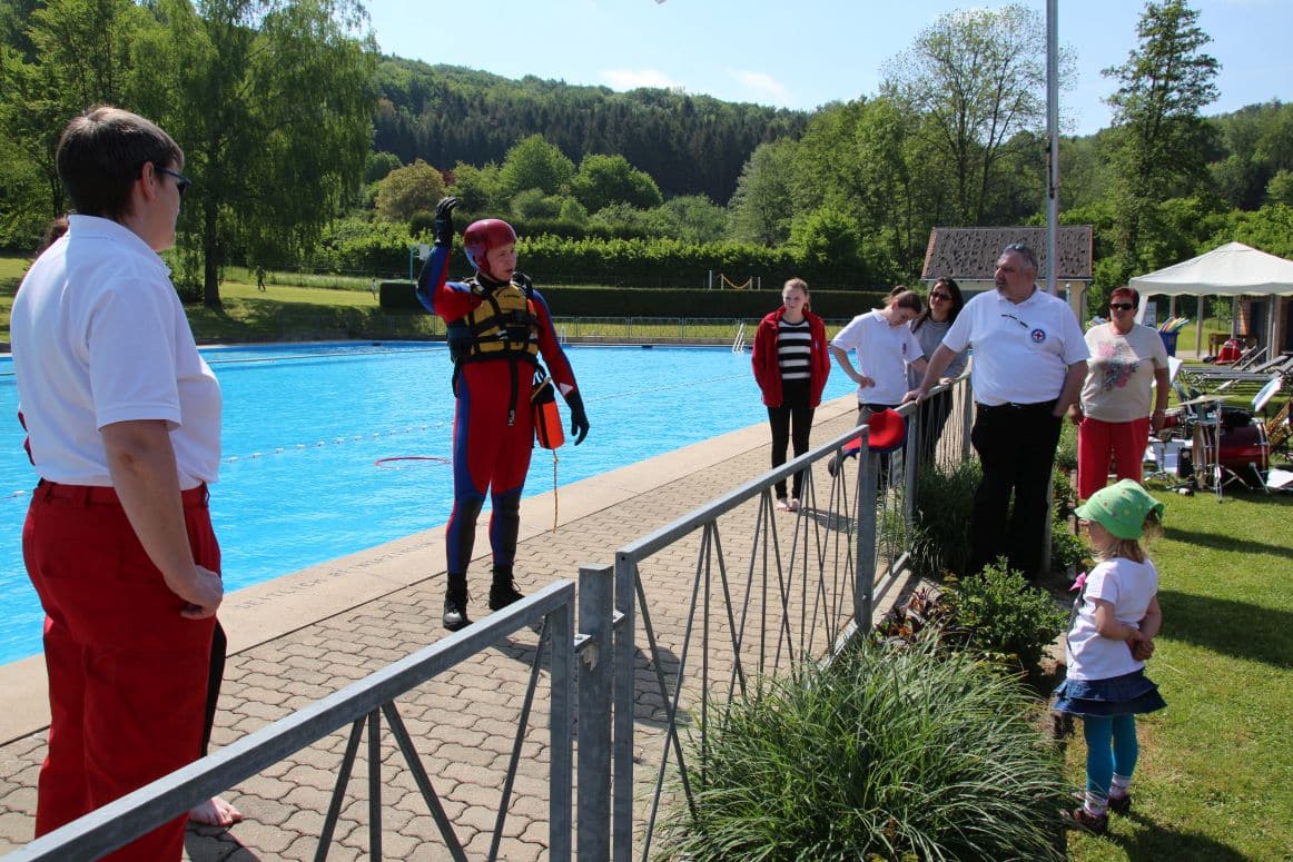 Ab 9 Uhr schloss sich ein zünftiges Weißwurstfrühstück mit flotter Blasmusik von „the kEschers“ an. Die junge siebenköpfige Formation verstand es mit Klassikern und fetzigen Stücken in Badeshorts und Sonnenbrille hervorragend, eine lockere Stimmung unter den zahlreichen Gästen zu verbreiten. Mehrere Männergruppen nutzten den Frühschoppen als erste Station ihres Vatertagsaufluges. Unter blauem Himmel starteten auch einige Familien in die Freibadsaison. Die Kinder nahmen augenblicklich die neuen Spielgeräte in Beschlag und testeten die Windverhältnisse an der Tischtennisplatte oder die Effekte der Hangneigung an den kleinen Fußballtoren. Die Wasserwacht bot eine Übungseinheit mit Rettungsgeräten für jedermann an. Mit Wurfball, Wurfball und Rettungsring galt es, einen etwa zehn Meter entfernt im Wasser fixierten Ring zu treffen. In der Pause der „kEschers“ stellt Bettina Kremer, Vorsitzende der Wasserwacht-Ortsgruppe, einen Wasserretter in voller Montur vor. Als Wasserretter dürfe sich ein Rettungsschwimmer bezeichnen, der zusätzlich eine Ausbildung zum Sanitäter und Rettungskurs und Prüfung im Freiwasser abgeschlossen habe, erläuterte sie. Wasserretter Valentin Helbig erklärte die Komponenten seiner Ausrüstung an Neoprenanzug und Schwimmweste, zu der sogar eine Gartenschere gehört. „Und wenn ich hier ziehe“, deutete er auf einen kurzen Seilzug an der Front seiner Schwimmweste, „dann geht der Fallschirm auf“, mutmaßten die gutgelaunten Besucher am vordersten Tisch. „An der Leine wird er dann herumgeführt wie ein Kerwabär“, zogen sie feixend weitere bekannte Parallelen. Die Fachkräfte der Wasserrettung nahmen die Kommentare mit Humor, verpassten es aber nicht, die Bedeutung ihrer Ausbildung zu unterstreichen. Dass die Leine dazu dient, den fest damit verbundenen Retter mit einem Opfer rasch an Land zurückzuziehen und dass der Seilzug an der Schwimmweste es dem Rettungsschwimmer wiederum ermöglicht, sich in Notsituationen von der Leine zu lösen, demonstrierte Helbig mit der Unterstützung der Rettungsschwimmer Lisa und Vanessa Döring und Lea Kremer. Über weitere Aktionen der Wasserwacht informierte die Ortsgruppe mit einer Schautafel.