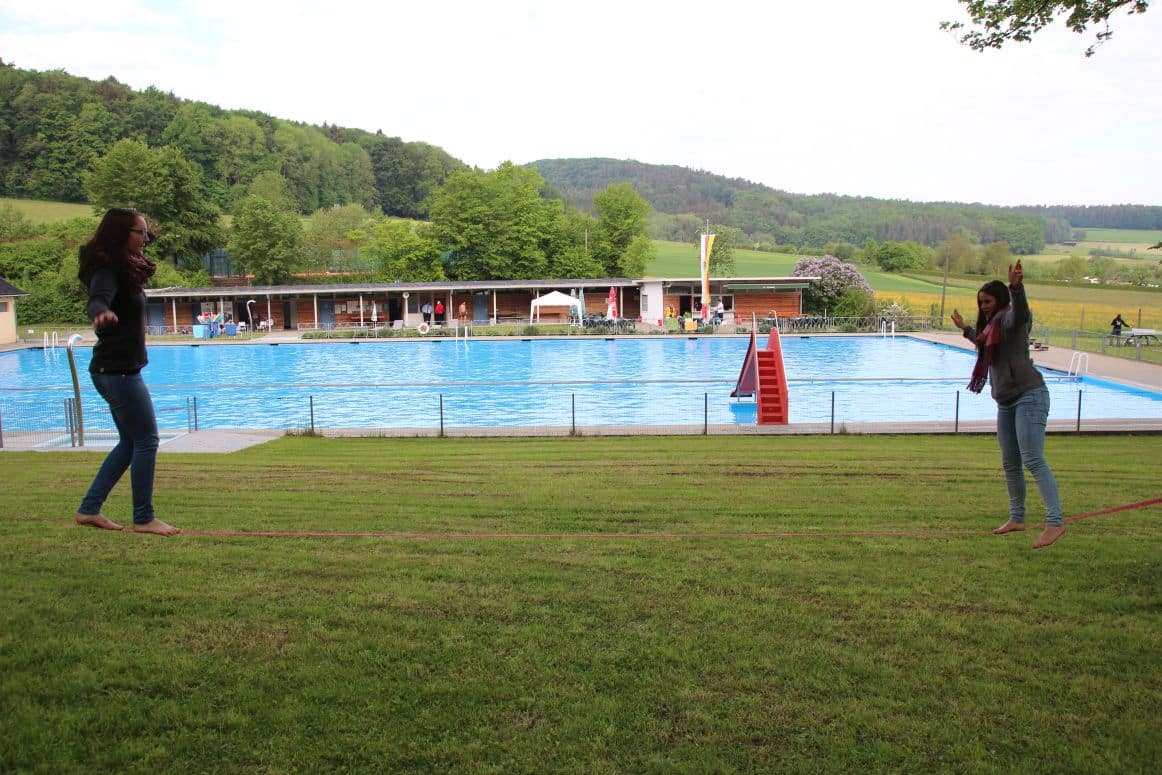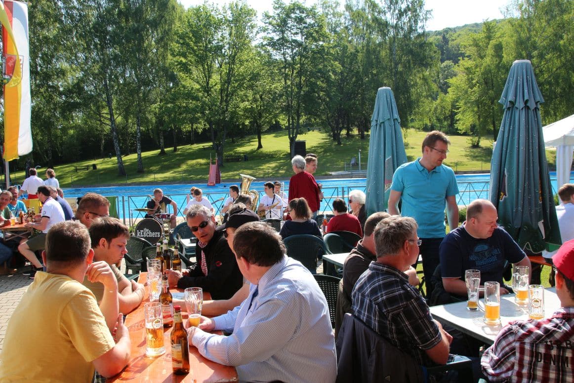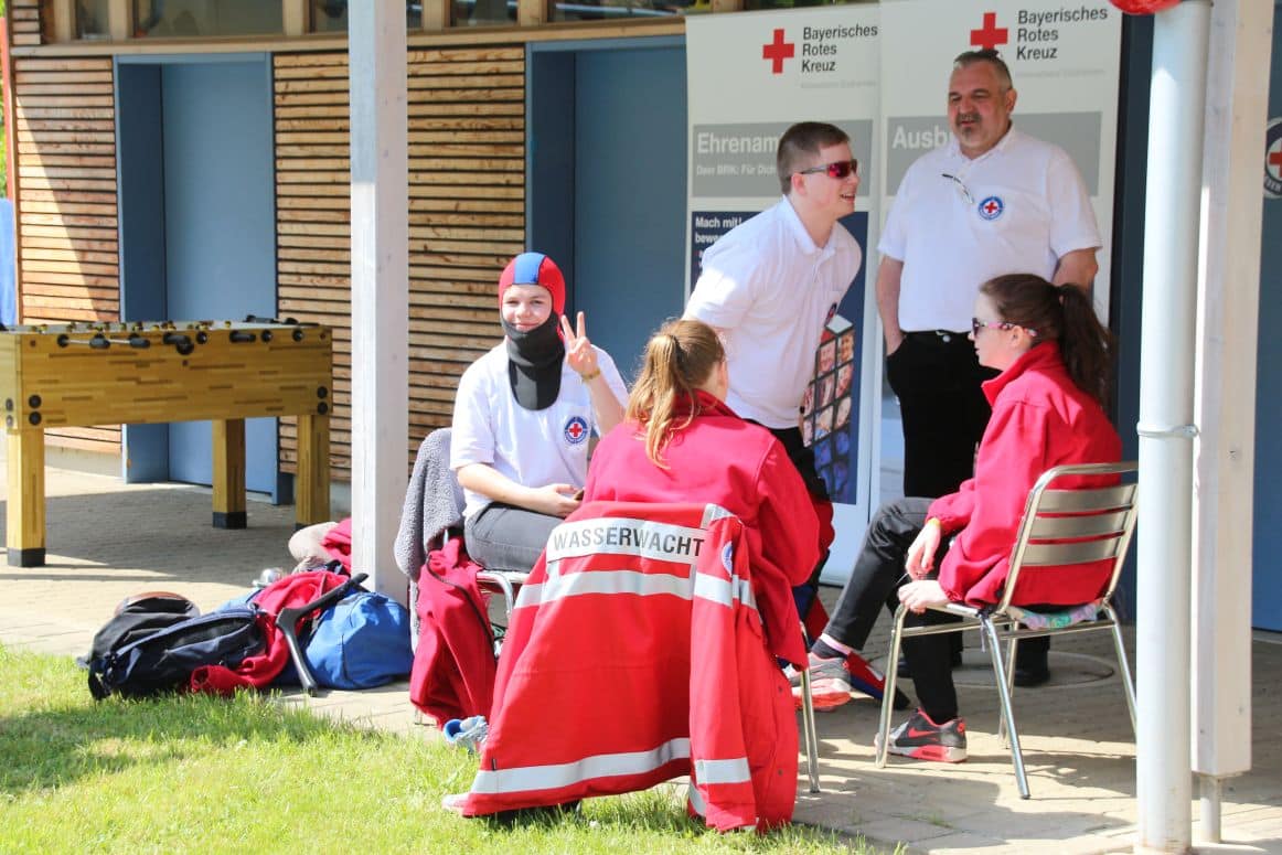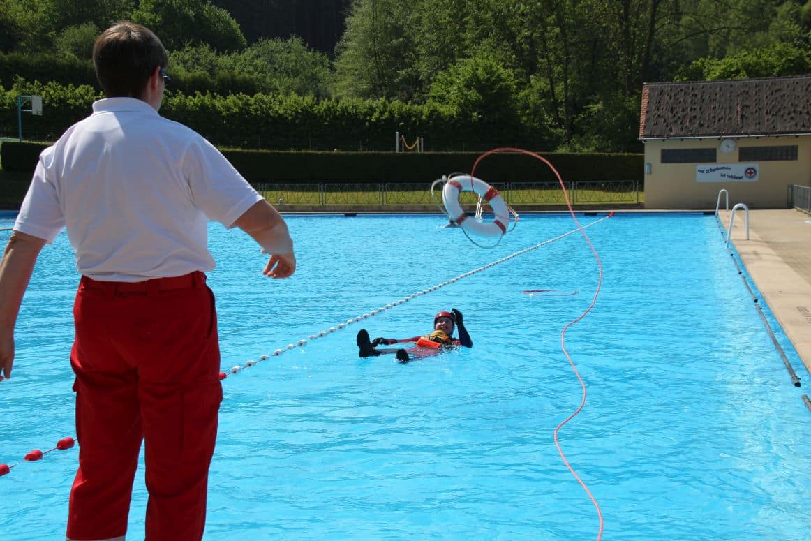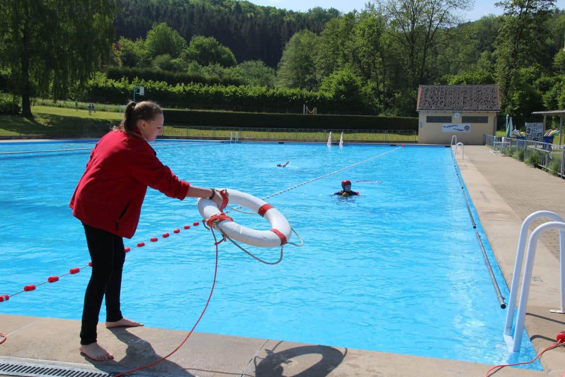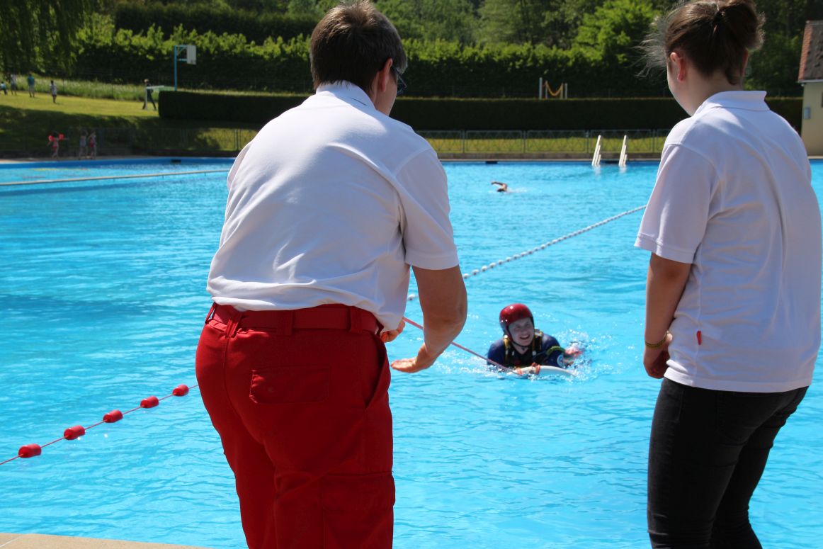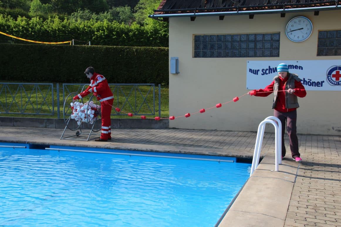 Ab 9 Uhr schloss sich ein zünftiges Weißwurstfrühstück mit flotter Blasmusik von „the kEschers“ an. Die junge siebenköpfige Formation verstand es mit Klassikern und fetzigen Stücken in Badeshorts und Sonnenbrille hervorragend, eine lockere Stimmung unter den zahlreichen Gästen zu verbreiten. Mehrere Männergruppen nutzten den Frühschoppen als erste Station ihres Vatertagsaufluges. Unter blauem Himmel starteten auch einige Familien in die Freibadsaison. Die Kinder nahmen augenblicklich die neuen Spielgeräte in Beschlag und testeten die Windverhältnisse an der Tischtennisplatte oder die Effekte der Hangneigung an den kleinen Fußballtoren. Die Wasserwacht bot eine Übungseinheit mit Rettungsgeräten für jedermann an. Mit Wurfball, Wurfball und Rettungsring galt es, einen etwa zehn Meter entfernt im Wasser fixierten Ring zu treffen. In der Pause der „kEschers“ stellt Bettina Kremer, Vorsitzende der Wasserwacht-Ortsgruppe, einen Wasserretter in voller Montur vor. Als Wasserretter dürfe sich ein Rettungsschwimmer bezeichnen, der zusätzlich eine Ausbildung zum Sanitäter und Rettungskurs und Prüfung im Freiwasser abgeschlossen habe, erläuterte sie. Wasserretter Valentin Helbig erklärte die Komponenten seiner Ausrüstung an Neoprenanzug und Schwimmweste, zu der sogar eine Gartenschere gehört. „Und wenn ich hier ziehe“, deutete er auf einen kurzen Seilzug an der Front seiner Schwimmweste, „dann geht der Fallschirm auf“, mutmaßten die gutgelaunten Besucher am vordersten Tisch. „An der Leine wird er dann herumgeführt wie ein Kerwabär“, zogen sie feixend weitere bekannte Parallelen. Die Fachkräfte der Wasserrettung nahmen die Kommentare mit Humor, verpassten es aber nicht, die Bedeutung ihrer Ausbildung zu unterstreichen. Dass die Leine dazu dient, den fest damit verbundenen Retter mit einem Opfer rasch an Land zurückzuziehen und dass der Seilzug an der Schwimmweste es dem Rettungsschwimmer wiederum ermöglicht, sich in Notsituationen von der Leine zu lösen, demonstrierte Helbig mit der Unterstützung der Rettungsschwimmer Lisa und Vanessa Döring und Lea Kremer. Über weitere Aktionen der Wasserwacht informierte die Ortsgruppe mit einer Schautafel.