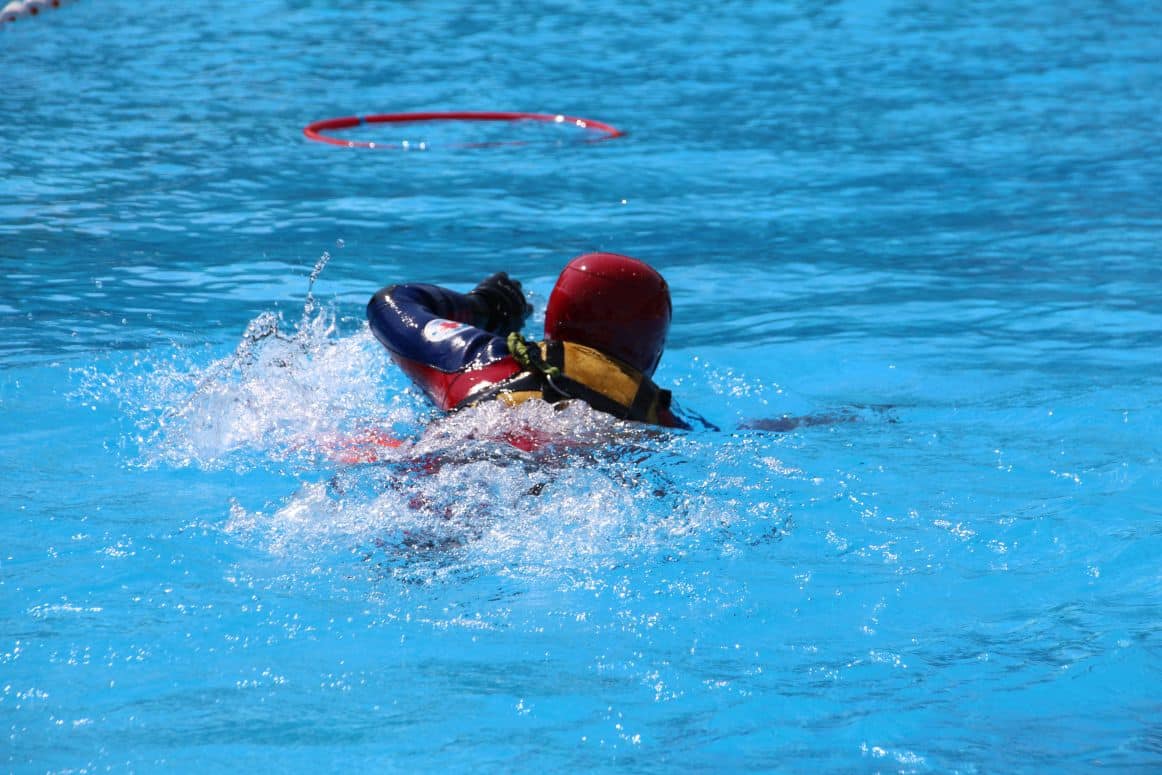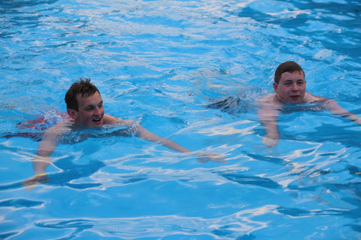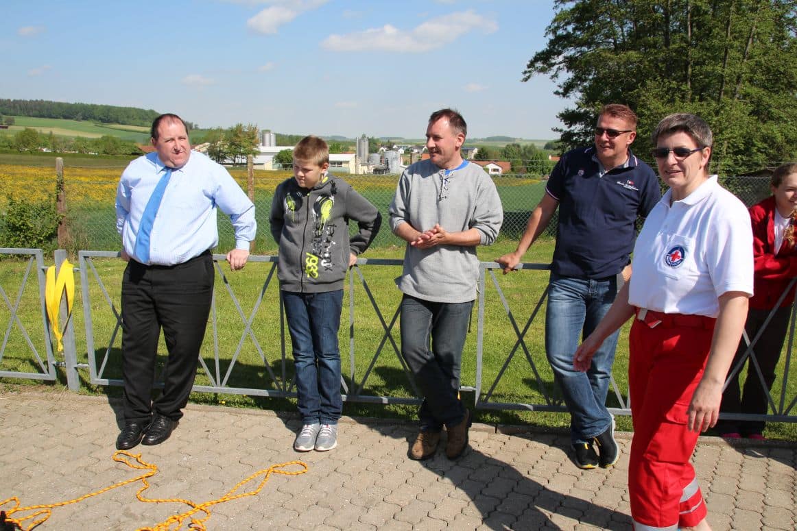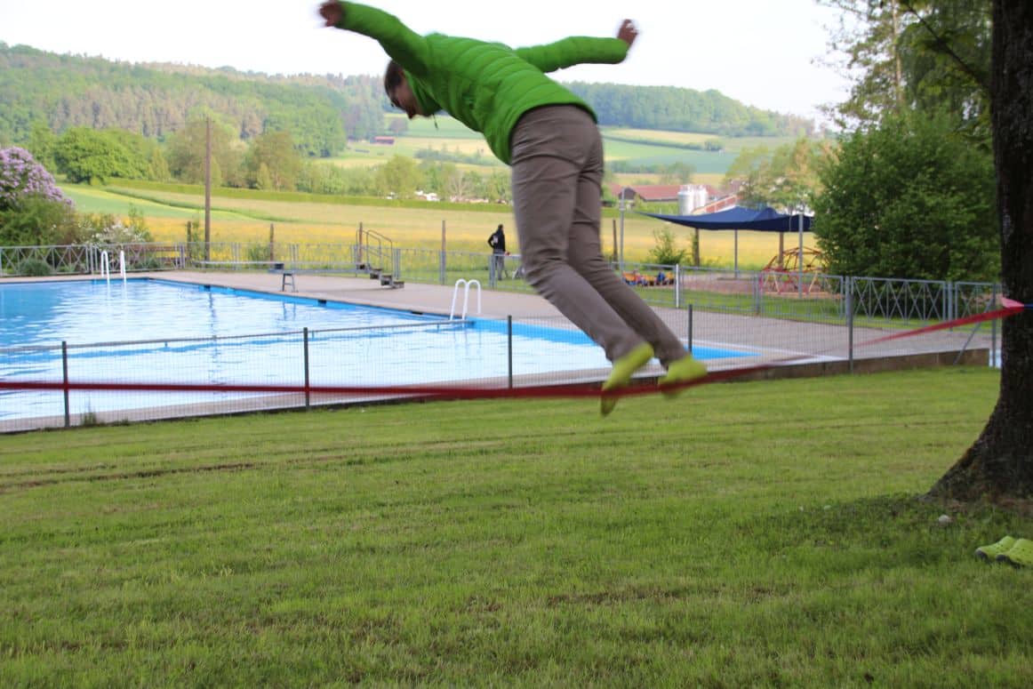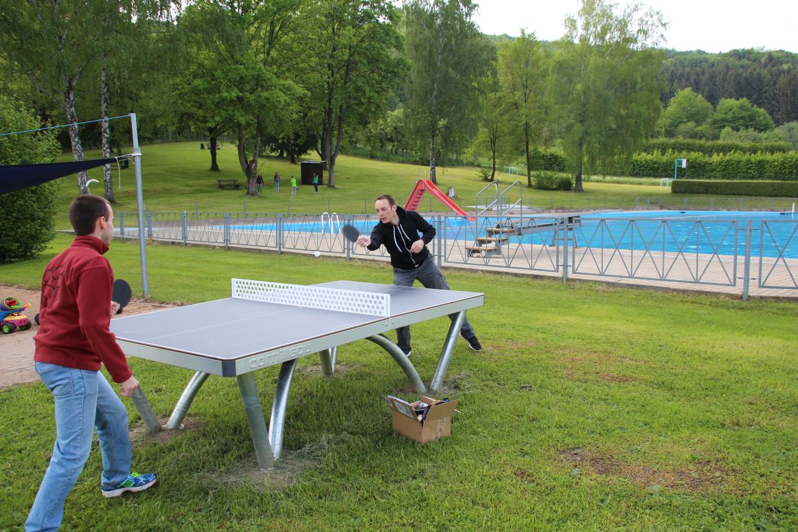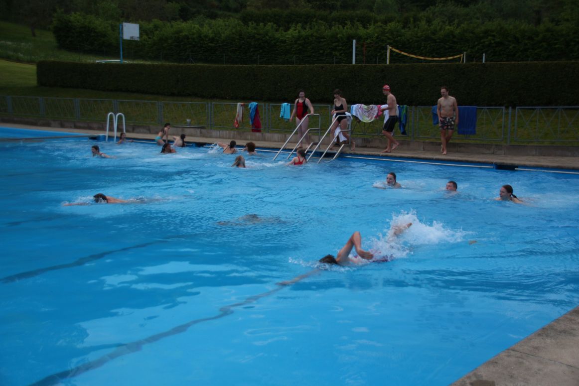 Ab 9 Uhr schloss sich ein zünftiges Weißwurstfrühstück mit flotter Blasmusik von „the kEschers“ an. Die junge siebenköpfige Formation verstand es mit Klassikern und fetzigen Stücken in Badeshorts und Sonnenbrille hervorragend, eine lockere Stimmung unter den zahlreichen Gästen zu verbreiten. Mehrere Männergruppen nutzten den Frühschoppen als erste Station ihres Vatertagsaufluges. Unter blauem Himmel starteten auch einige Familien in die Freibadsaison. Die Kinder nahmen augenblicklich die neuen Spielgeräte in Beschlag und testeten die Windverhältnisse an der Tischtennisplatte oder die Effekte der Hangneigung an den kleinen Fußballtoren. Die Wasserwacht bot eine Übungseinheit mit Rettungsgeräten für jedermann an. Mit Wurfball, Wurfball und Rettungsring galt es, einen etwa zehn Meter entfernt im Wasser fixierten Ring zu treffen. In der Pause der „kEschers“ stellt Bettina Kremer, Vorsitzende der Wasserwacht-Ortsgruppe, einen Wasserretter in voller Montur vor. Als Wasserretter dürfe sich ein Rettungsschwimmer bezeichnen, der zusätzlich eine Ausbildung zum Sanitäter und Rettungskurs und Prüfung im Freiwasser abgeschlossen habe, erläuterte sie. Wasserretter Valentin Helbig erklärte die Komponenten seiner Ausrüstung an Neoprenanzug und Schwimmweste, zu der sogar eine Gartenschere gehört. „Und wenn ich hier ziehe“, deutete er auf einen kurzen Seilzug an der Front seiner Schwimmweste, „dann geht der Fallschirm auf“, mutmaßten die gutgelaunten Besucher am vordersten Tisch. „An der Leine wird er dann herumgeführt wie ein Kerwabär“, zogen sie feixend weitere bekannte Parallelen. Die Fachkräfte der Wasserrettung nahmen die Kommentare mit Humor, verpassten es aber nicht, die Bedeutung ihrer Ausbildung zu unterstreichen. Dass die Leine dazu dient, den fest damit verbundenen Retter mit einem Opfer rasch an Land zurückzuziehen und dass der Seilzug an der Schwimmweste es dem Rettungsschwimmer wiederum ermöglicht, sich in Notsituationen von der Leine zu lösen, demonstrierte Helbig mit der Unterstützung der Rettungsschwimmer Lisa und Vanessa Döring und Lea Kremer. Über weitere Aktionen der Wasserwacht informierte die Ortsgruppe mit einer Schautafel.
