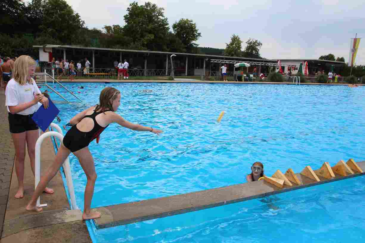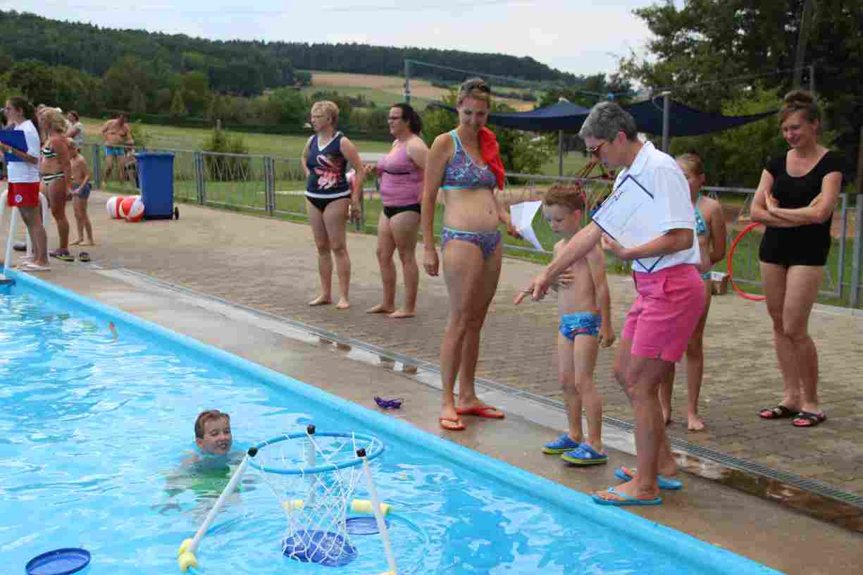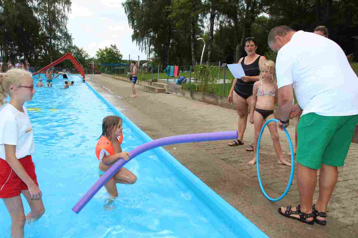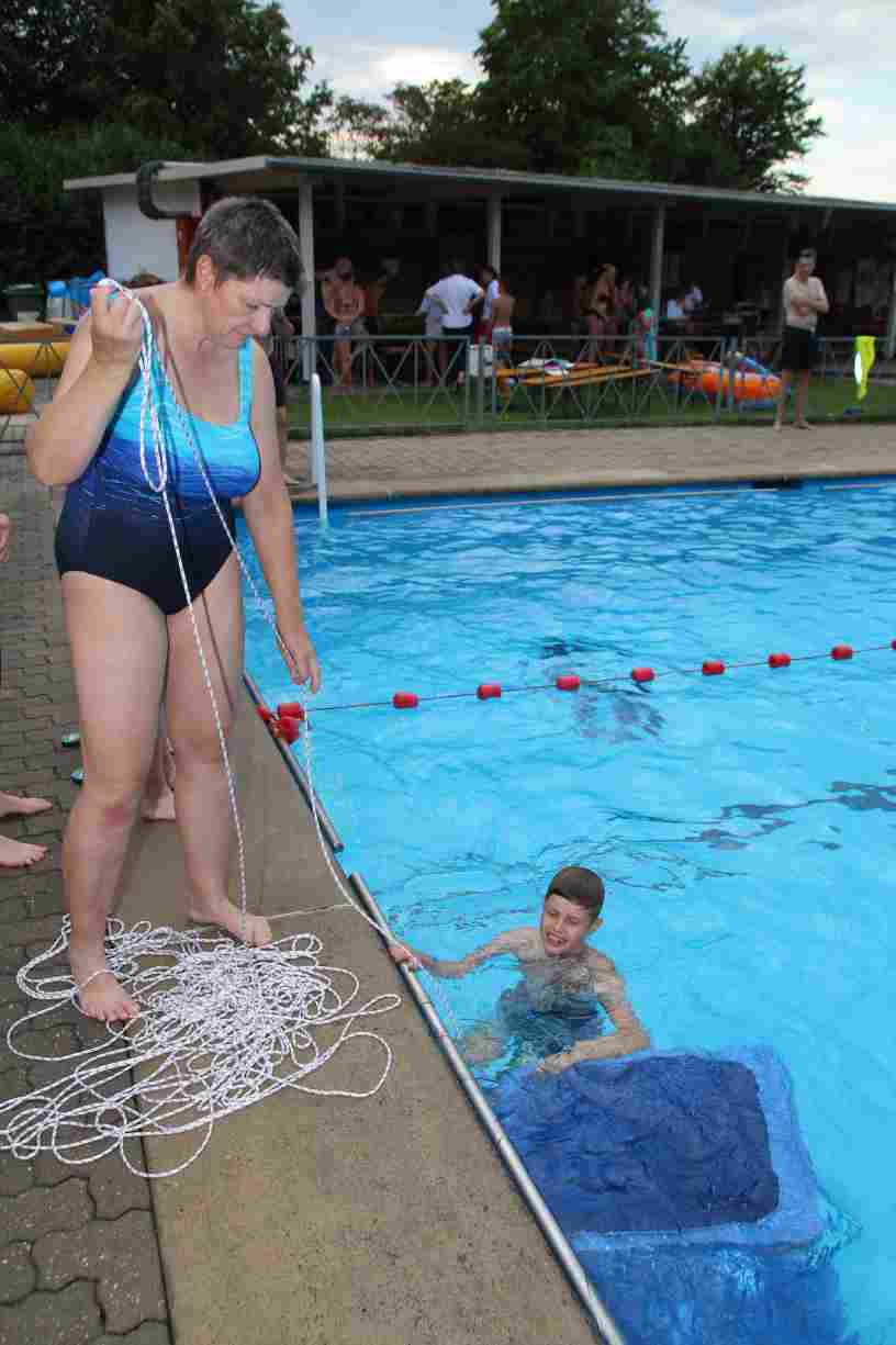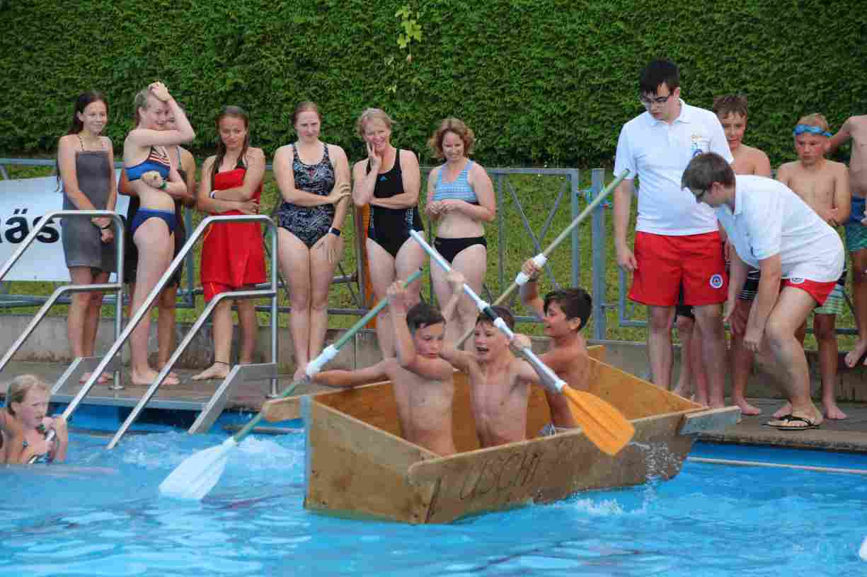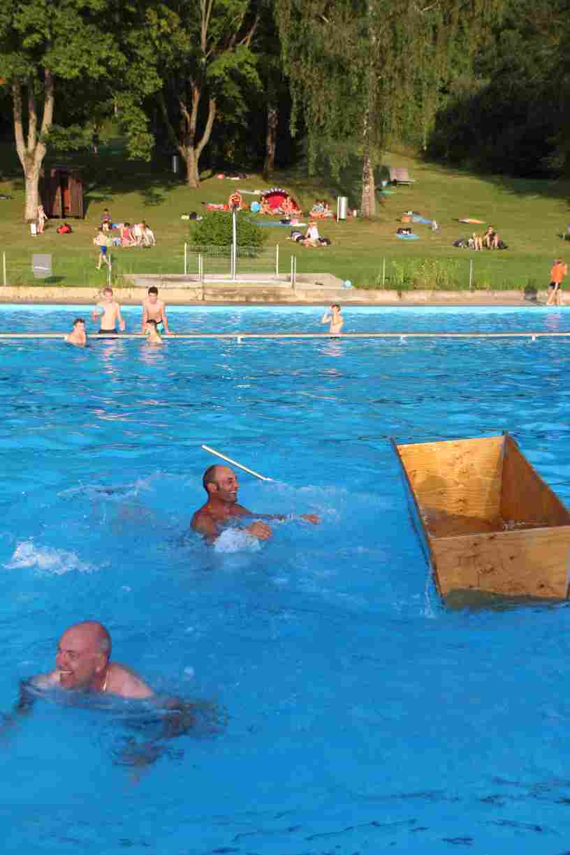Das erste Badfest mit neuem Konzept wurde mit herrlichem Sommerwetter und einer wahren Besucherschar belohnt. An 9 Spielestationen für Schwimmer und 3 Stationen für Nichtschwimmer gab es zwei Stunden lang allerlei Trubel. Etwa 110 Teilnehmer wagten sich an die Aufgaben. Dabei galt es, beim Sprint Schnelligkeit und beim Balance-Labyrinth Geschicklichkeit zu beweisen. Ein gutes Auge war auch beim Kegeln mit Tauchringen gefragt. Alles Tarieren half beim Frisbee-Zielwerfen manchmal nichts, denn es dauert einige Würfe, bis man den Bogen raus hat. Einige Naturtalente haben wir auch entdeckt: Beim Luftmatratzen-Wettrennen wart ihr nicht nur schnell, sondern auch mit teils perfekter Paddeltechnik am Werk. Mit unkonventioneller Ausrüstung gings bei der Würfelstaffel ins Wasser: Möglichst schnell musste ein Dreierteam eine Warnweste, Schwimmkappe, Flipflops und ein Paar Putzhandschuhe anziehen – schwierig nur, dass das Würfelglück entschied, wann es weitergehen durfte. Um pure Kraft ging es beim Bierfässla-Weitwurf. Die konnte auch bei der neuen Tauchdisziplin nicht schaden: In 30 Sekunden musste eine versenkte Mülltonne unter Wasser möglichst weit geschoben werden. Scheinbar leicht erschien dagegen die Aufgabe, Wasserbälle zu transportieren – wären es nicht 10 für 2 Arme gewesen 🙂