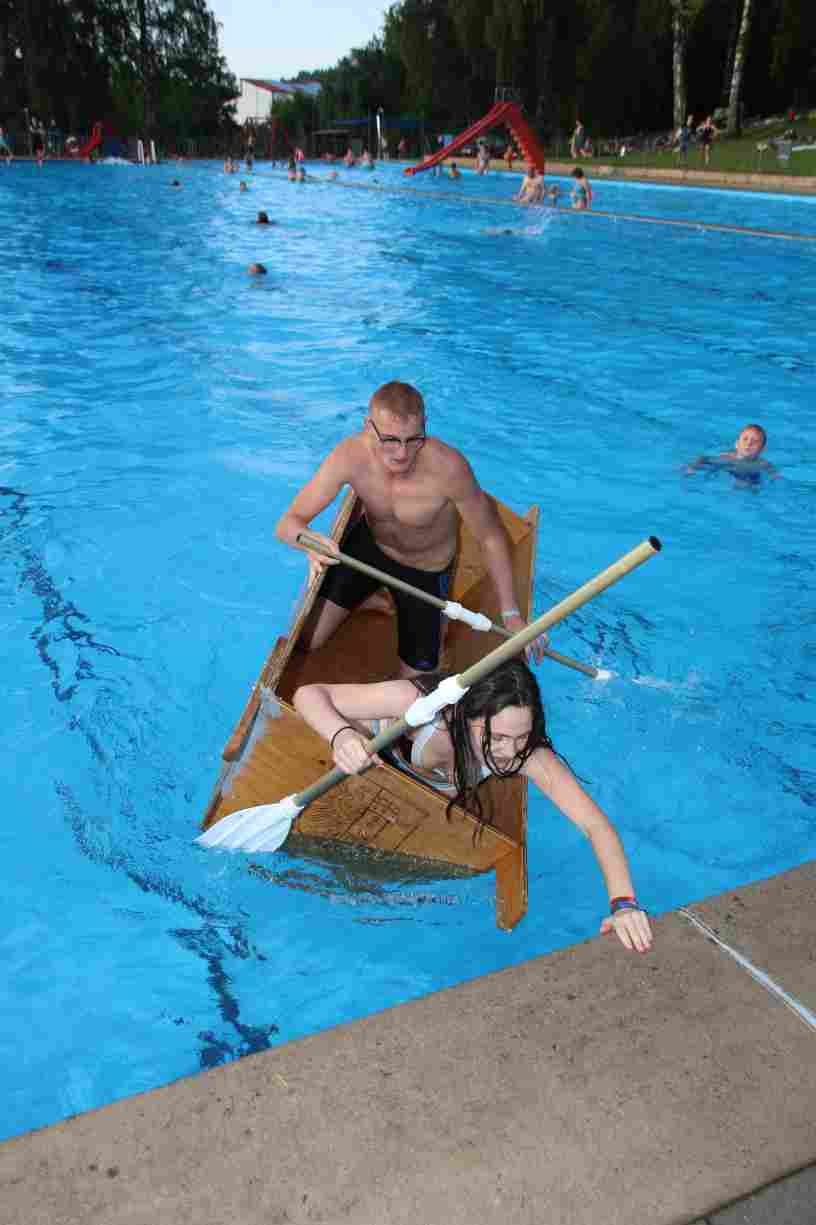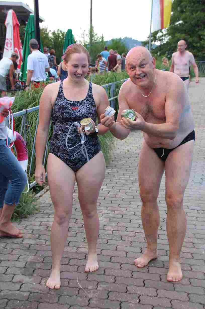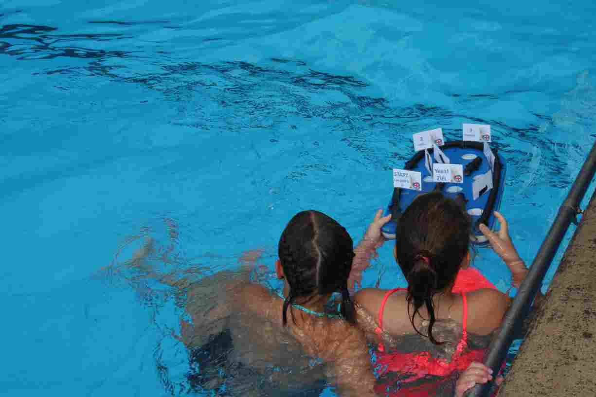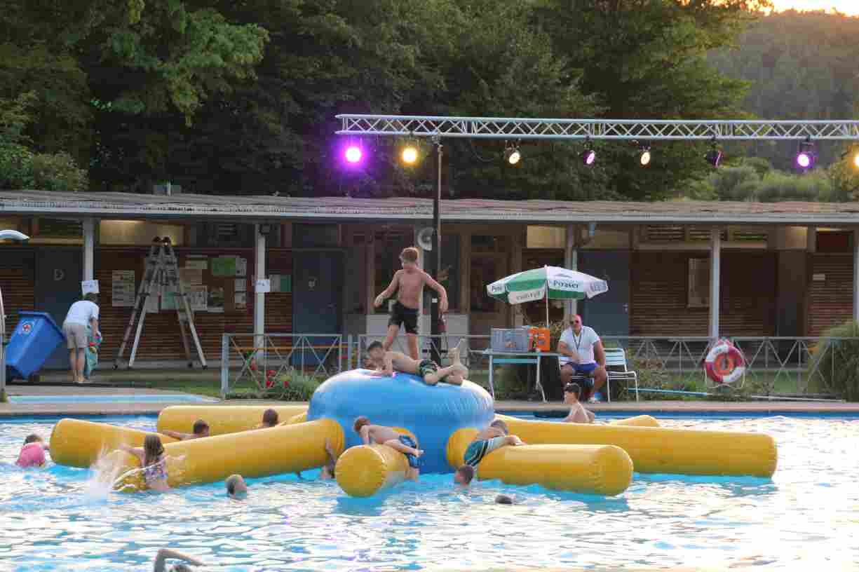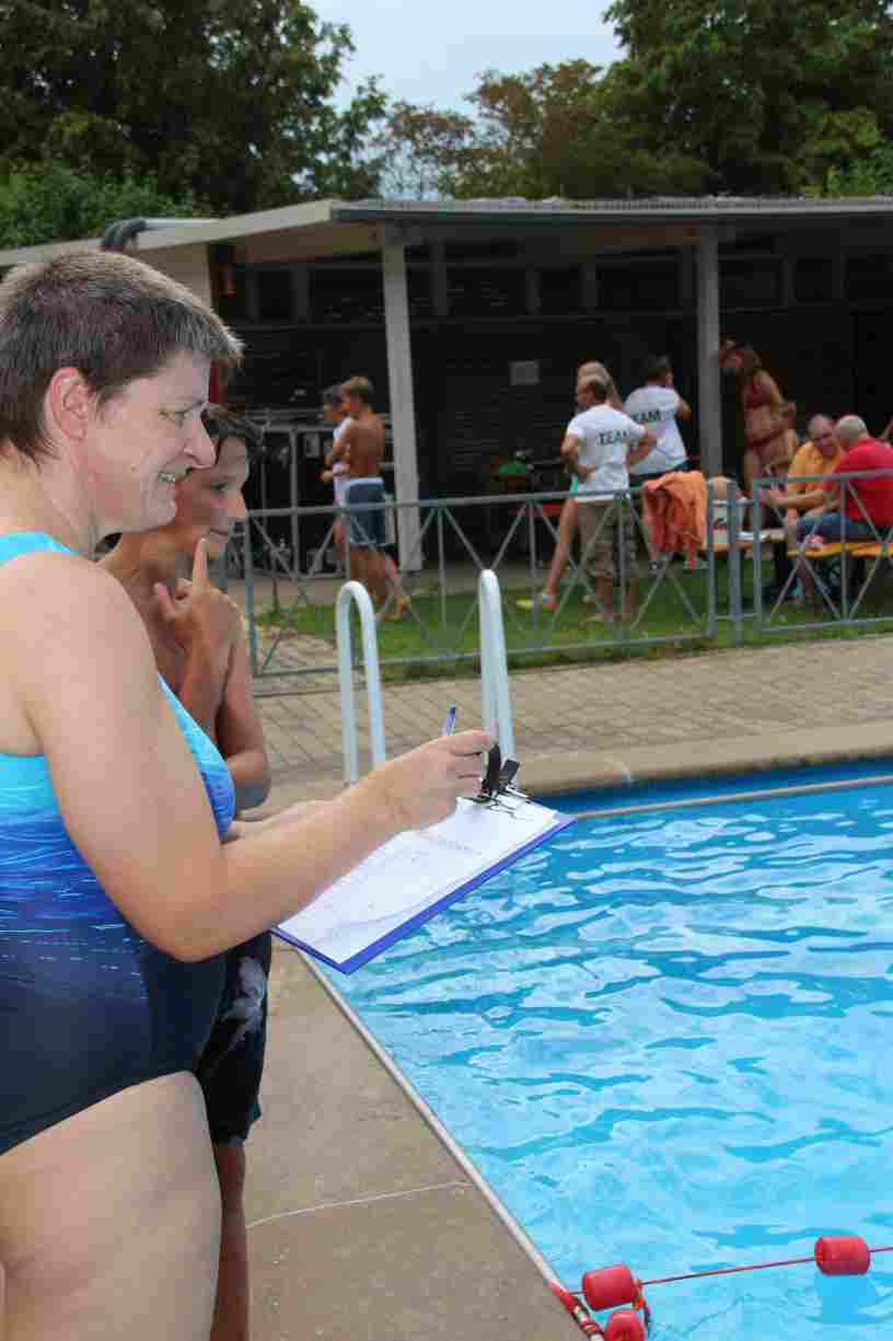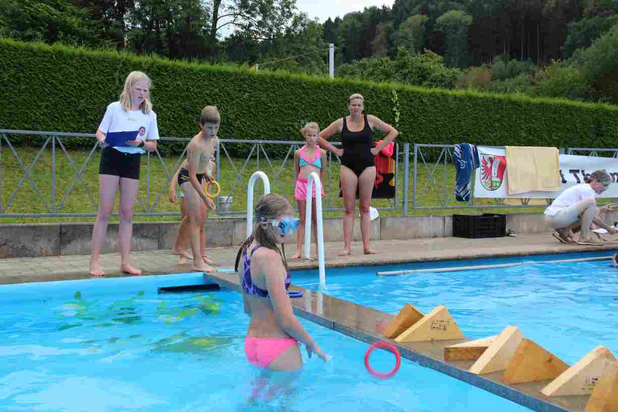 Das erste Badfest mit neuem Konzept wurde mit herrlichem Sommerwetter und einer wahren Besucherschar belohnt. An 9 Spielestationen für Schwimmer und 3 Stationen für Nichtschwimmer gab es zwei Stunden lang allerlei Trubel. Etwa 110 Teilnehmer wagten sich an die Aufgaben. Dabei galt es, beim Sprint Schnelligkeit und beim Balance-Labyrinth Geschicklichkeit zu beweisen. Ein gutes Auge war auch beim Kegeln mit Tauchringen gefragt. Alles Tarieren half beim Frisbee-Zielwerfen manchmal nichts, denn es dauert einige Würfe, bis man den Bogen raus hat. Einige Naturtalente haben wir auch entdeckt: Beim Luftmatratzen-Wettrennen wart ihr nicht nur schnell, sondern auch mit teils perfekter Paddeltechnik am Werk. Mit unkonventioneller Ausrüstung gings bei der Würfelstaffel ins Wasser: Möglichst schnell musste ein Dreierteam eine Warnweste, Schwimmkappe, Flipflops und ein Paar Putzhandschuhe anziehen – schwierig nur, dass das Würfelglück entschied, wann es weitergehen durfte. Um pure Kraft ging es beim Bierfässla-Weitwurf. Die konnte auch bei der neuen Tauchdisziplin nicht schaden: In 30 Sekunden musste eine versenkte Mülltonne unter Wasser möglichst weit geschoben werden. Scheinbar leicht erschien dagegen die Aufgabe, Wasserbälle zu transportieren – wären es nicht 10 für 2 Arme gewesen 🙂