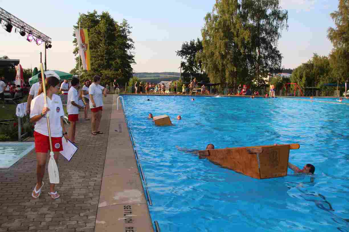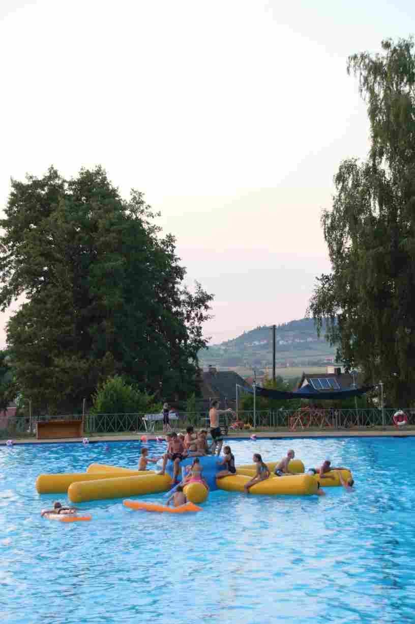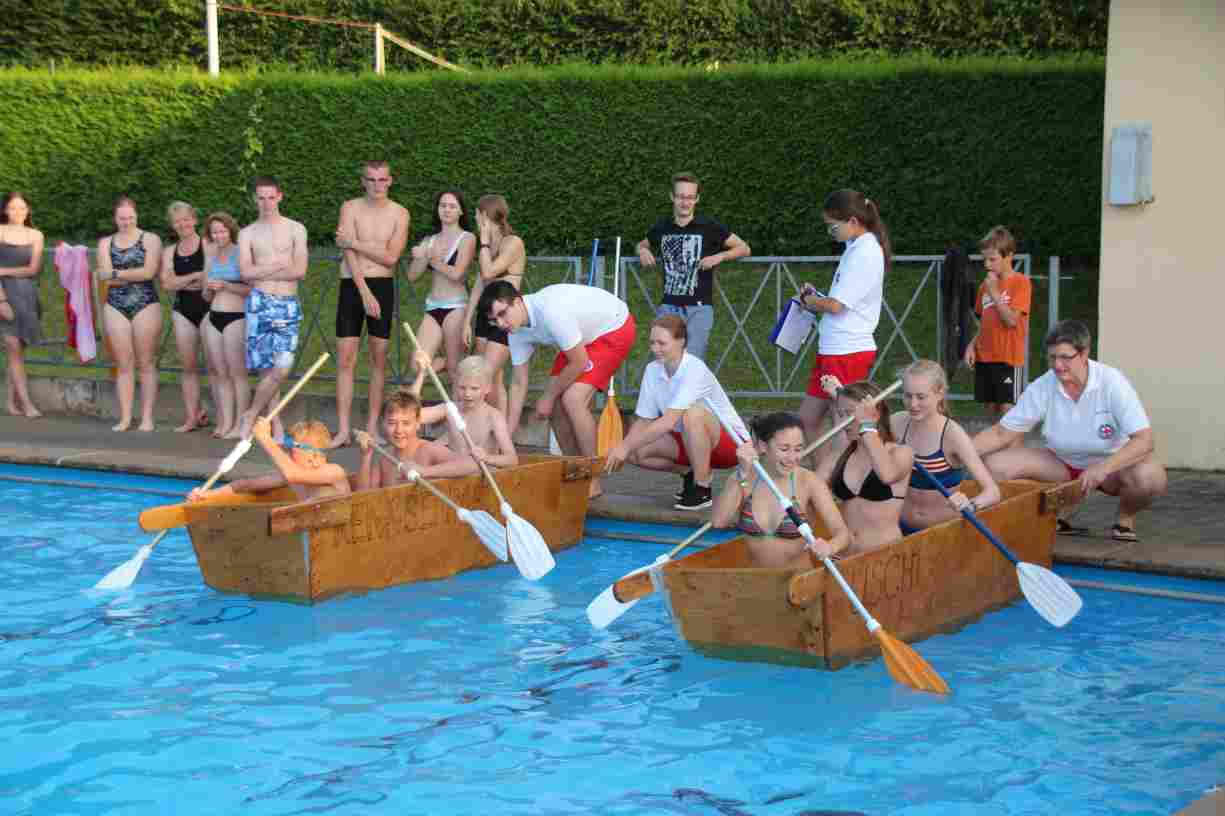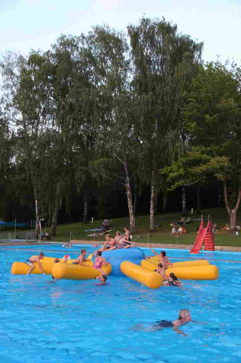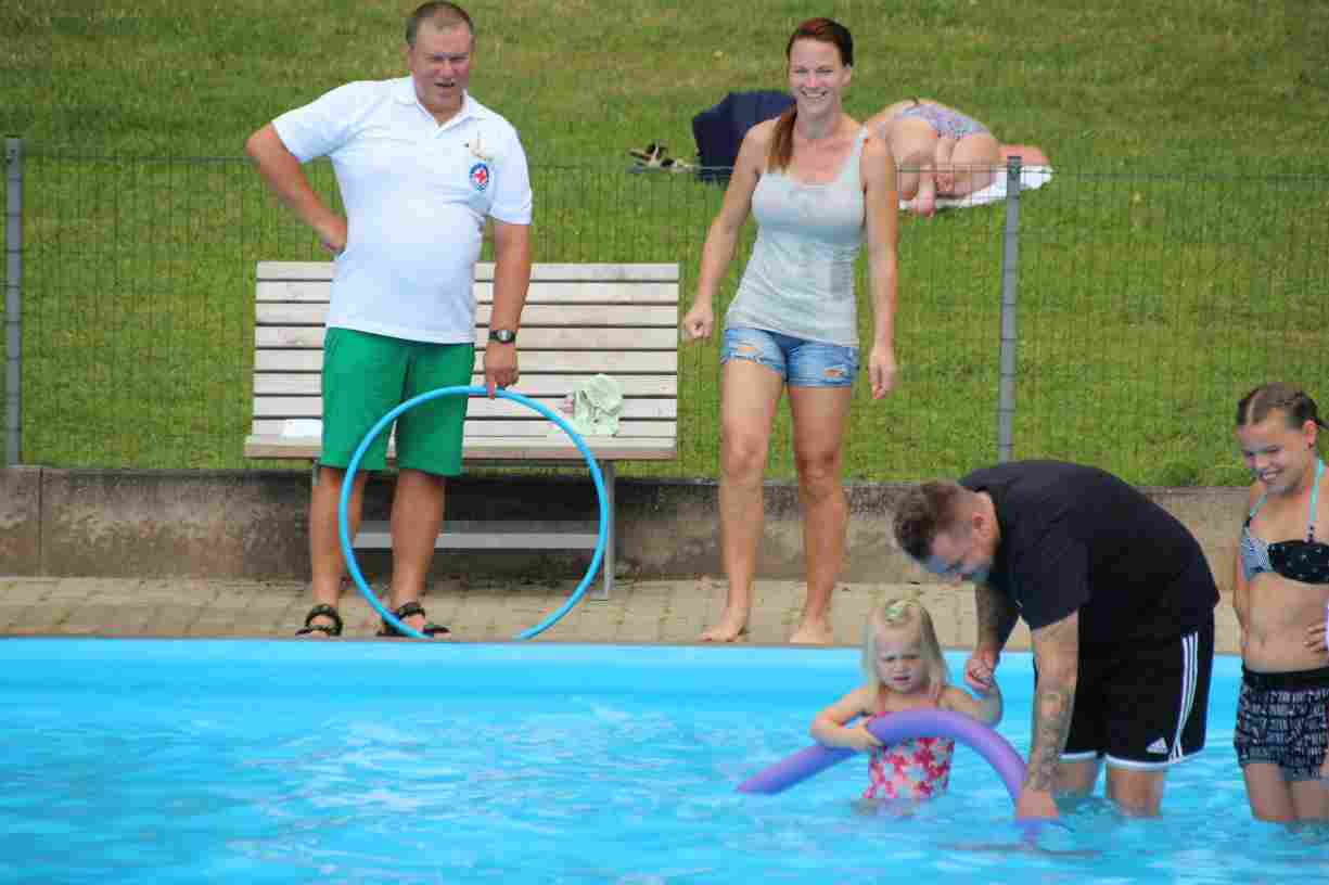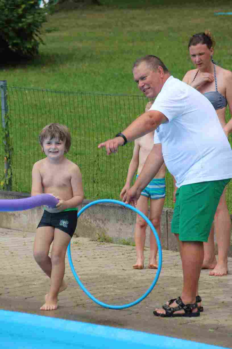Das erste Badfest mit neuem Konzept wurde mit herrlichem Sommerwetter und einer wahren Besucherschar belohnt. An 9 Spielestationen für Schwimmer und 3 Stationen für Nichtschwimmer gab es zwei Stunden lang allerlei Trubel. Etwa 110 Teilnehmer wagten sich an die Aufgaben. Dabei galt es, beim Sprint Schnelligkeit und beim Balance-Labyrinth Geschicklichkeit zu beweisen. Ein gutes Auge war auch beim Kegeln mit Tauchringen gefragt. Alles Tarieren half beim Frisbee-Zielwerfen manchmal nichts, denn es dauert einige Würfe, bis man den Bogen raus hat. Einige Naturtalente haben wir auch entdeckt: Beim Luftmatratzen-Wettrennen wart ihr nicht nur schnell, sondern auch mit teils perfekter Paddeltechnik am Werk. Mit unkonventioneller Ausrüstung gings bei der Würfelstaffel ins Wasser: Möglichst schnell musste ein Dreierteam eine Warnweste, Schwimmkappe, Flipflops und ein Paar Putzhandschuhe anziehen – schwierig nur, dass das Würfelglück entschied, wann es weitergehen durfte. Um pure Kraft ging es beim Bierfässla-Weitwurf. Die konnte auch bei der neuen Tauchdisziplin nicht schaden: In 30 Sekunden musste eine versenkte Mülltonne unter Wasser möglichst weit geschoben werden. Scheinbar leicht erschien dagegen die Aufgabe, Wasserbälle zu transportieren – wären es nicht 10 für 2 Arme gewesen 🙂