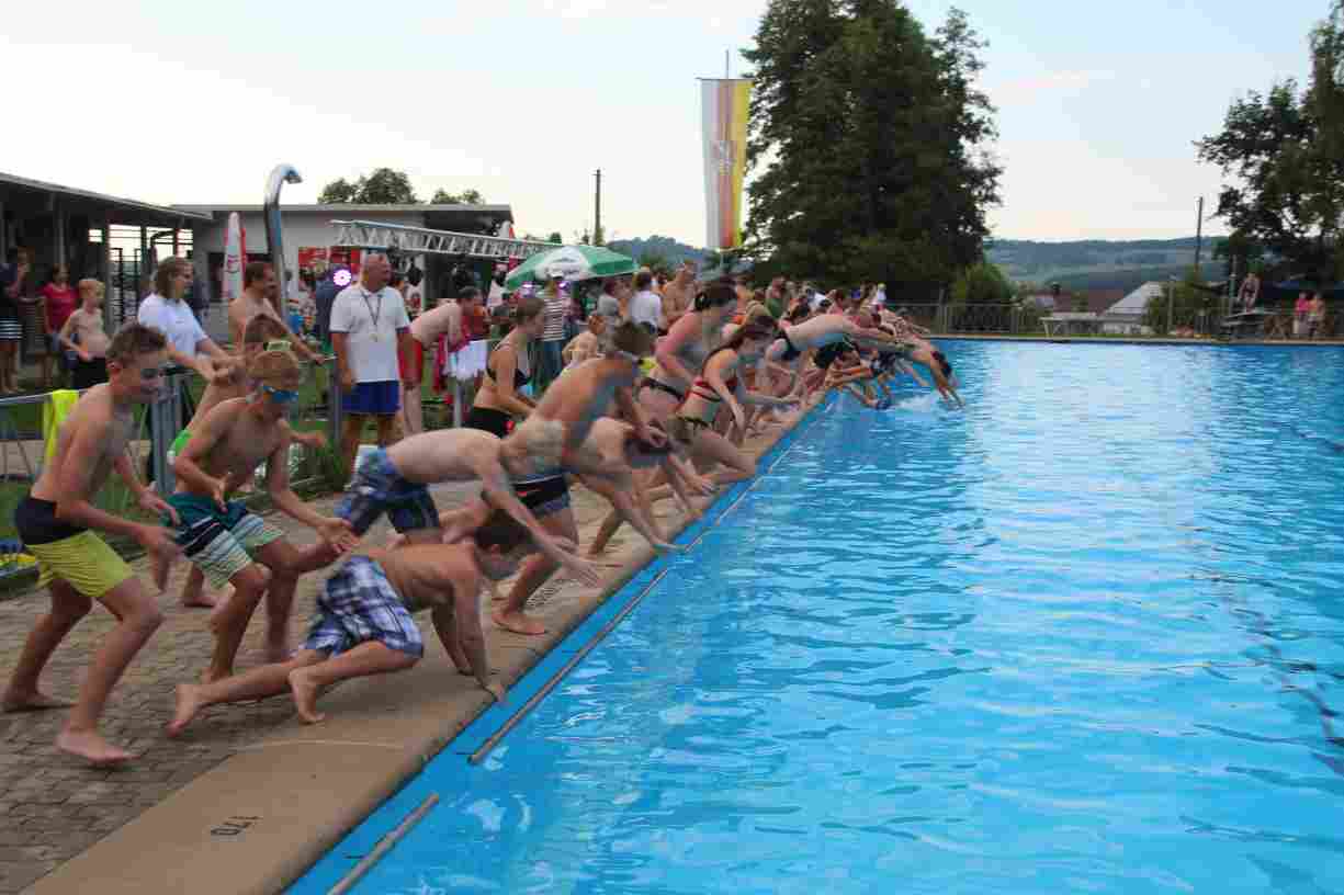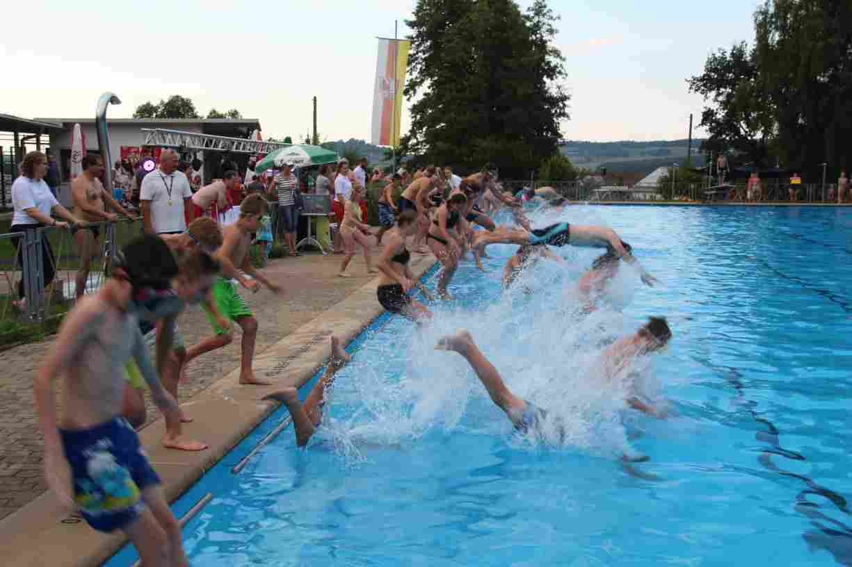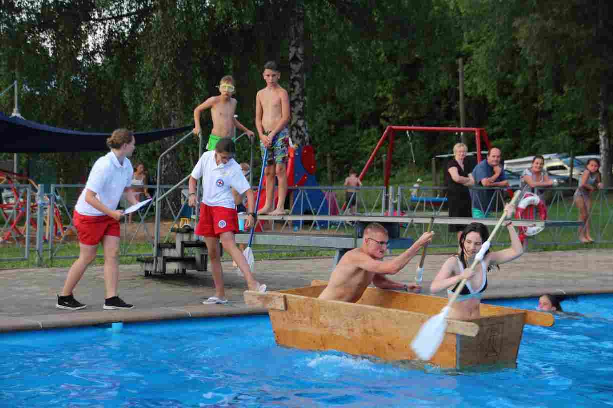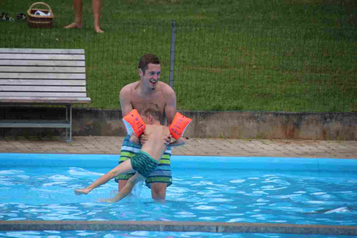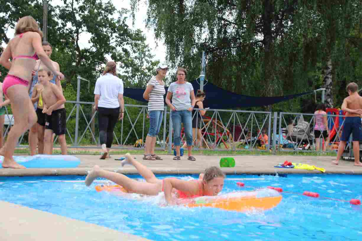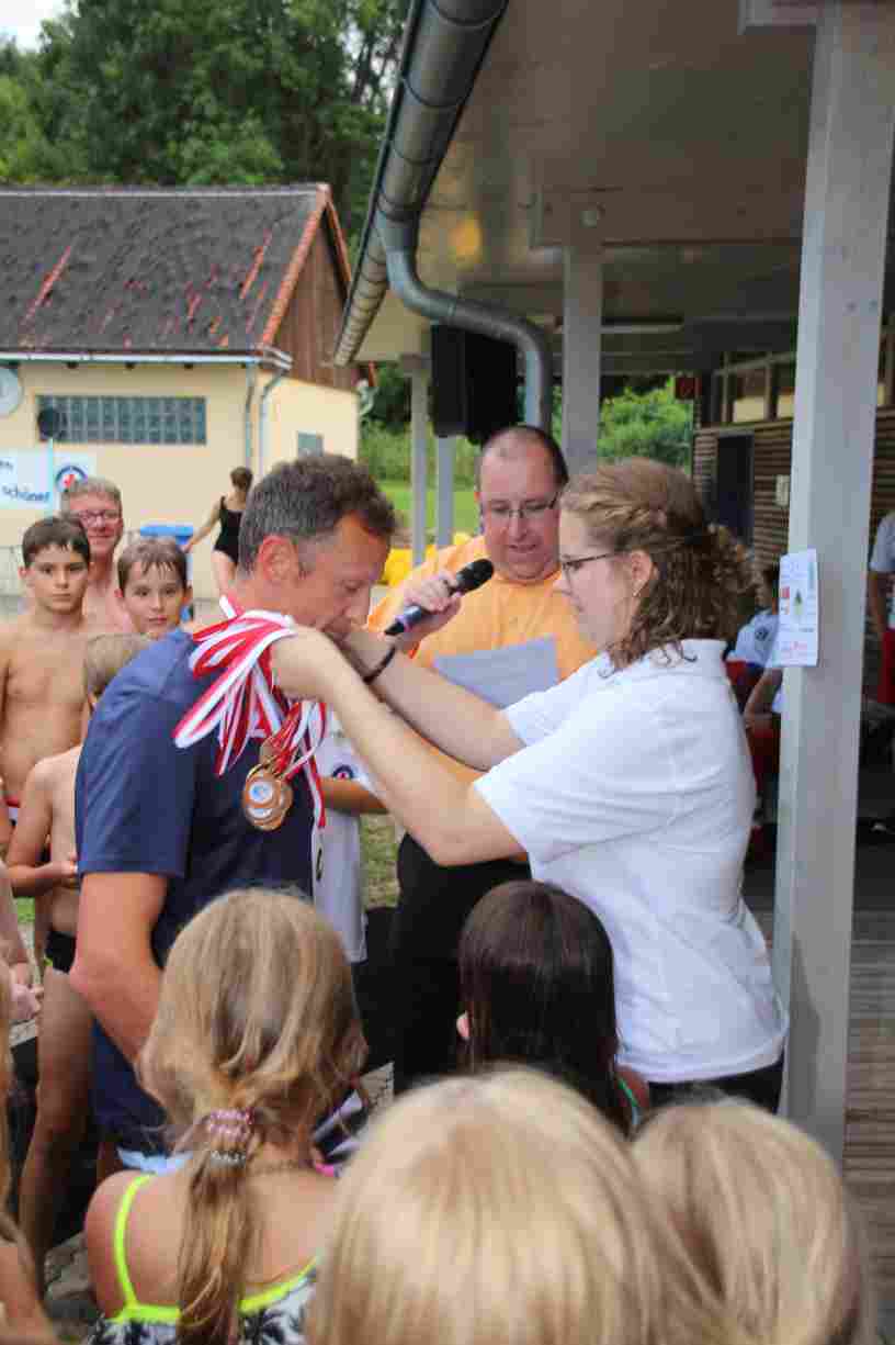 Das erste Badfest mit neuem Konzept wurde mit herrlichem Sommerwetter und einer wahren Besucherschar belohnt. An 9 Spielestationen für Schwimmer und 3 Stationen für Nichtschwimmer gab es zwei Stunden lang allerlei Trubel. Etwa 110 Teilnehmer wagten sich an die Aufgaben. Dabei galt es, beim Sprint Schnelligkeit und beim Balance-Labyrinth Geschicklichkeit zu beweisen. Ein gutes Auge war auch beim Kegeln mit Tauchringen gefragt. Alles Tarieren half beim Frisbee-Zielwerfen manchmal nichts, denn es dauert einige Würfe, bis man den Bogen raus hat. Einige Naturtalente haben wir auch entdeckt: Beim Luftmatratzen-Wettrennen wart ihr nicht nur schnell, sondern auch mit teils perfekter Paddeltechnik am Werk. Mit unkonventioneller Ausrüstung gings bei der Würfelstaffel ins Wasser: Möglichst schnell musste ein Dreierteam eine Warnweste, Schwimmkappe, Flipflops und ein Paar Putzhandschuhe anziehen – schwierig nur, dass das Würfelglück entschied, wann es weitergehen durfte. Um pure Kraft ging es beim Bierfässla-Weitwurf. Die konnte auch bei der neuen Tauchdisziplin nicht schaden: In 30 Sekunden musste eine versenkte Mülltonne unter Wasser möglichst weit geschoben werden. Scheinbar leicht erschien dagegen die Aufgabe, Wasserbälle zu transportieren – wären es nicht 10 für 2 Arme gewesen 🙂