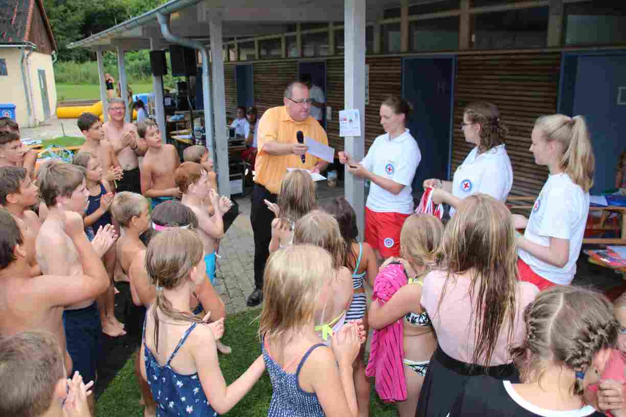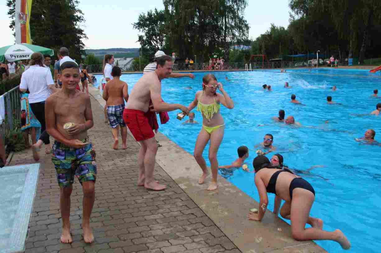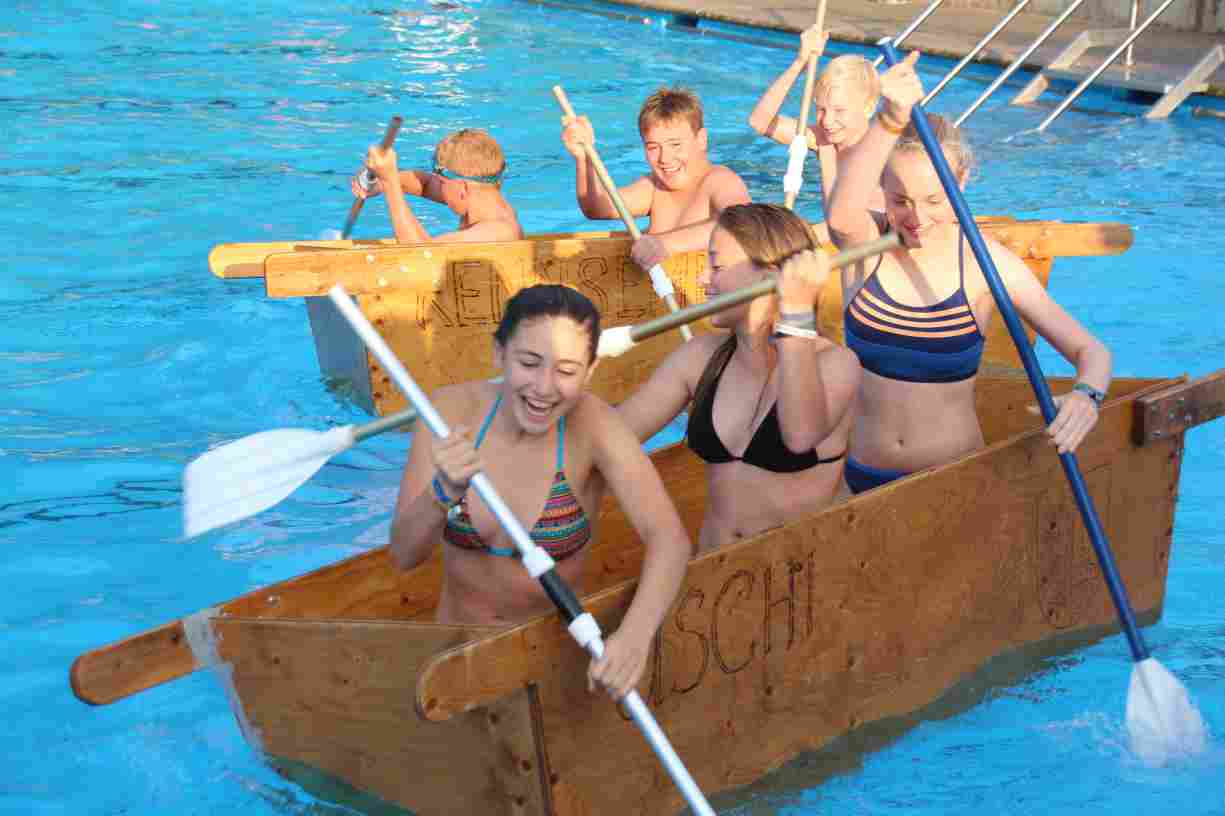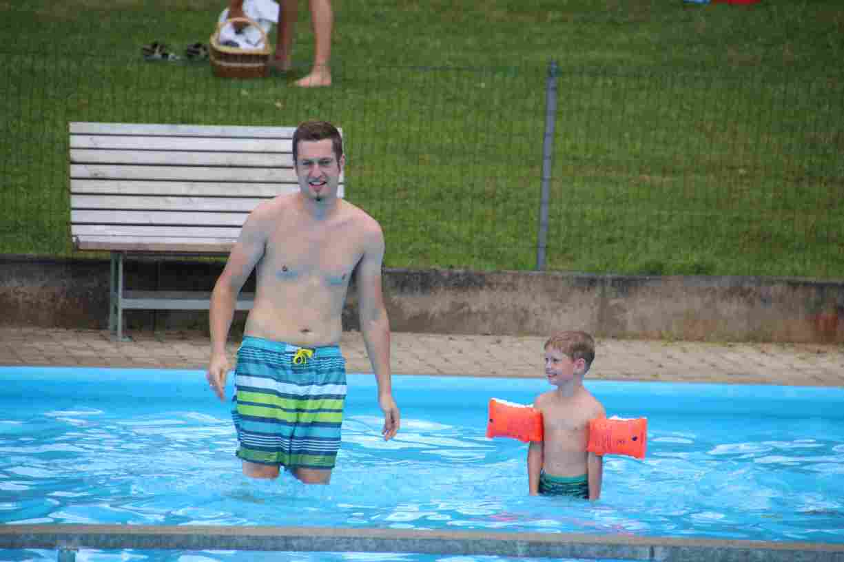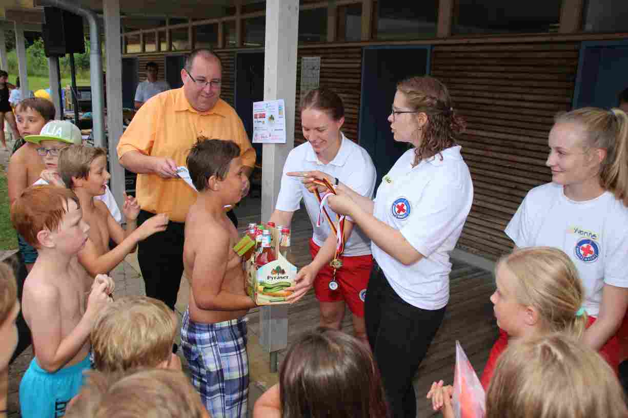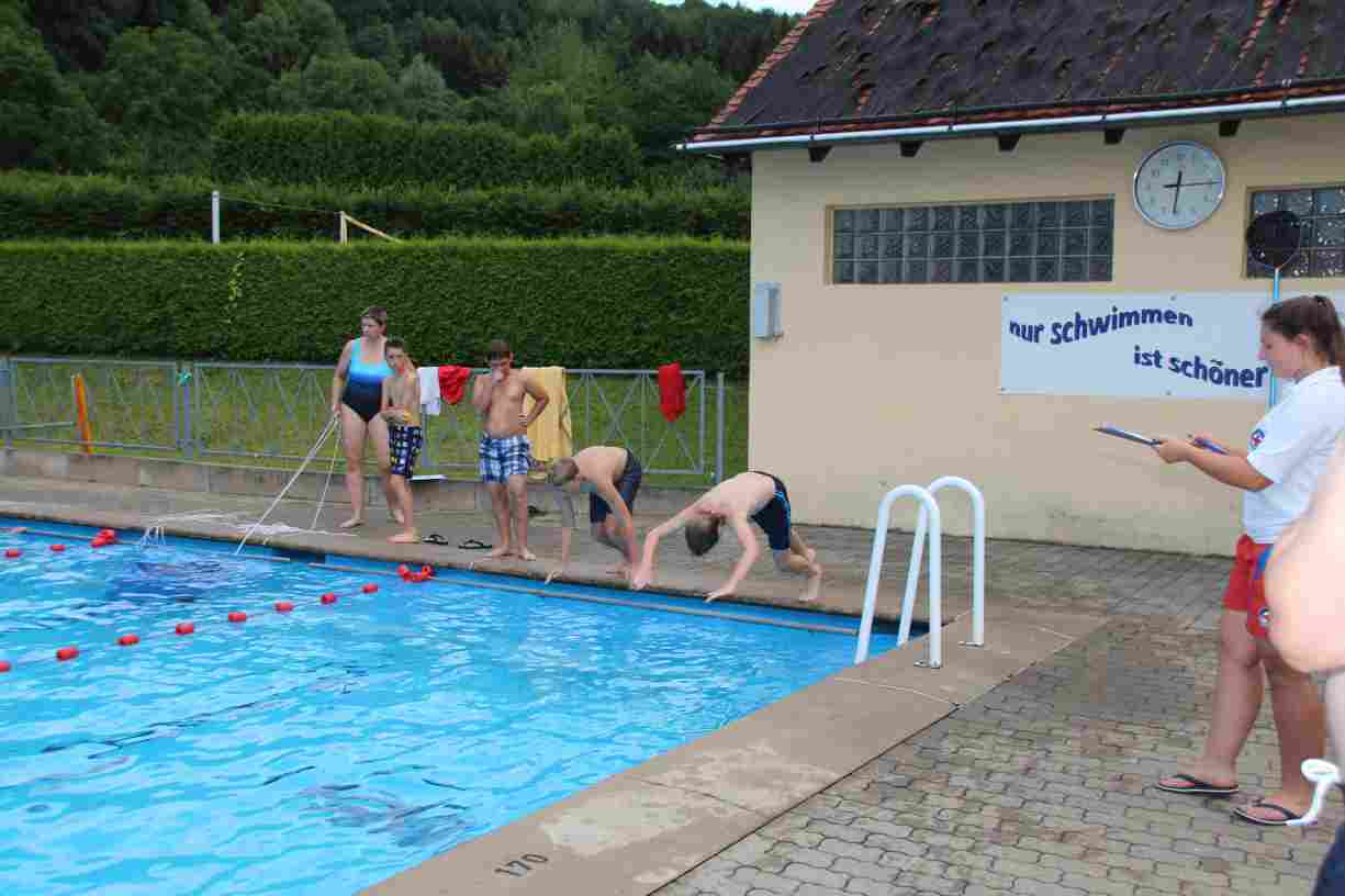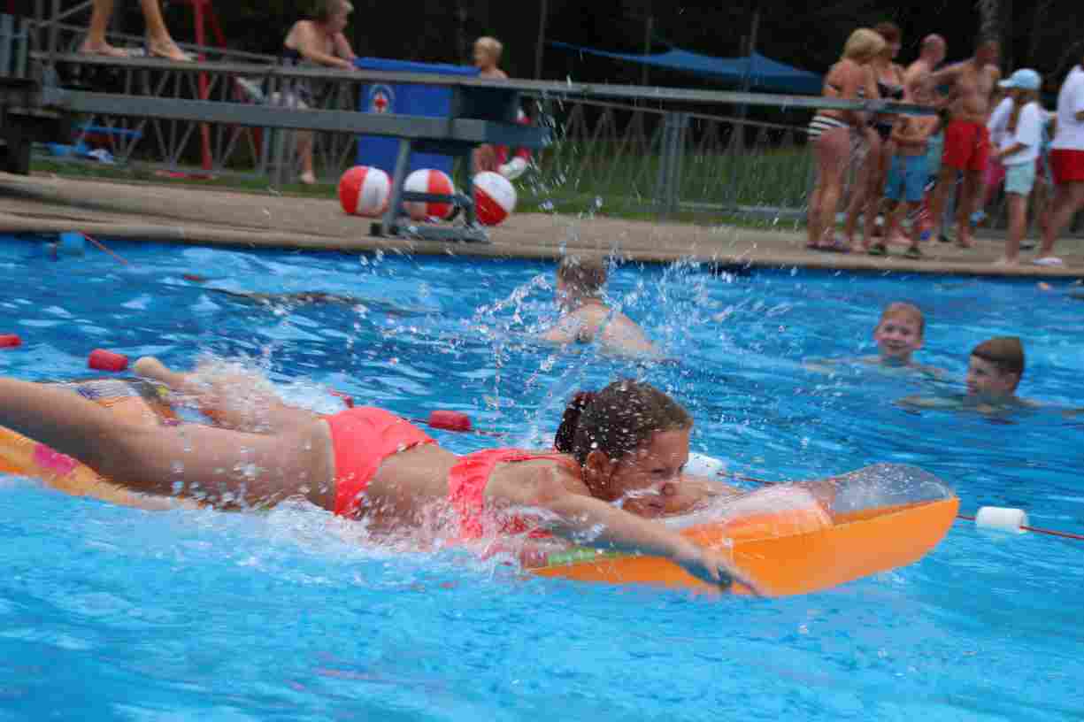 Das erste Badfest mit neuem Konzept wurde mit herrlichem Sommerwetter und einer wahren Besucherschar belohnt. An 9 Spielestationen für Schwimmer und 3 Stationen für Nichtschwimmer gab es zwei Stunden lang allerlei Trubel. Etwa 110 Teilnehmer wagten sich an die Aufgaben. Dabei galt es, beim Sprint Schnelligkeit und beim Balance-Labyrinth Geschicklichkeit zu beweisen. Ein gutes Auge war auch beim Kegeln mit Tauchringen gefragt. Alles Tarieren half beim Frisbee-Zielwerfen manchmal nichts, denn es dauert einige Würfe, bis man den Bogen raus hat. Einige Naturtalente haben wir auch entdeckt: Beim Luftmatratzen-Wettrennen wart ihr nicht nur schnell, sondern auch mit teils perfekter Paddeltechnik am Werk. Mit unkonventioneller Ausrüstung gings bei der Würfelstaffel ins Wasser: Möglichst schnell musste ein Dreierteam eine Warnweste, Schwimmkappe, Flipflops und ein Paar Putzhandschuhe anziehen – schwierig nur, dass das Würfelglück entschied, wann es weitergehen durfte. Um pure Kraft ging es beim Bierfässla-Weitwurf. Die konnte auch bei der neuen Tauchdisziplin nicht schaden: In 30 Sekunden musste eine versenkte Mülltonne unter Wasser möglichst weit geschoben werden. Scheinbar leicht erschien dagegen die Aufgabe, Wasserbälle zu transportieren – wären es nicht 10 für 2 Arme gewesen 🙂