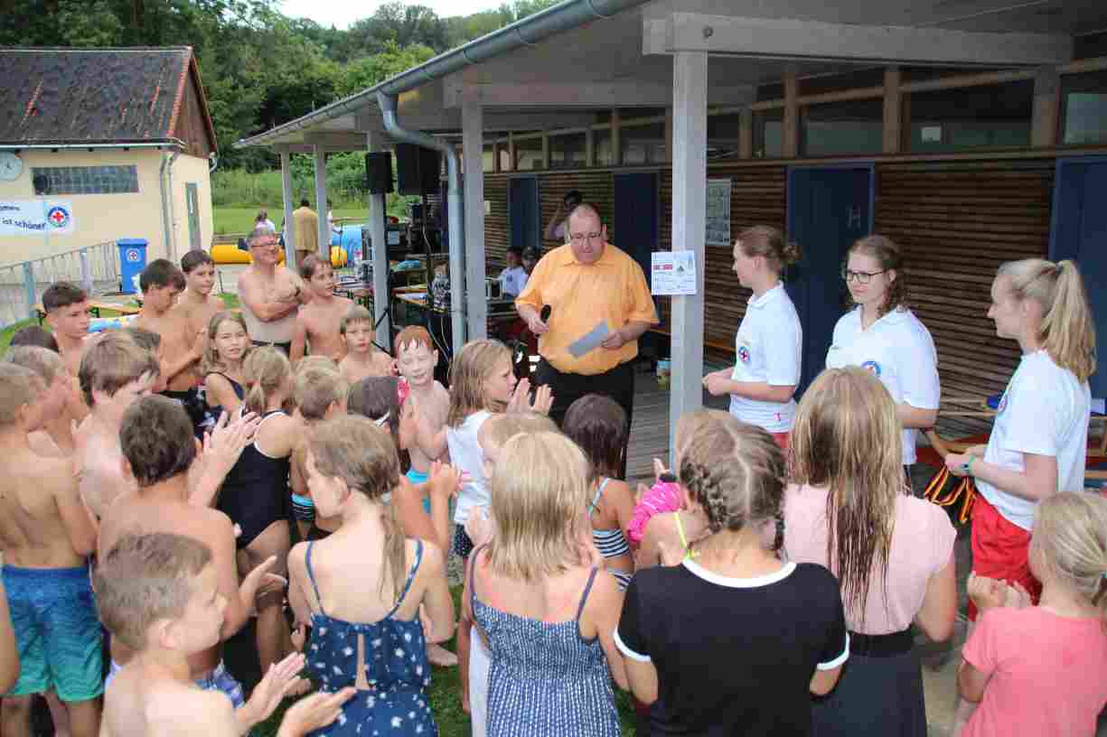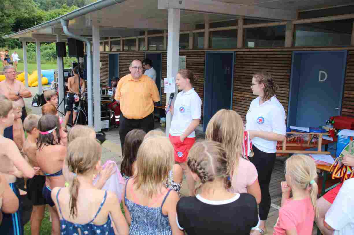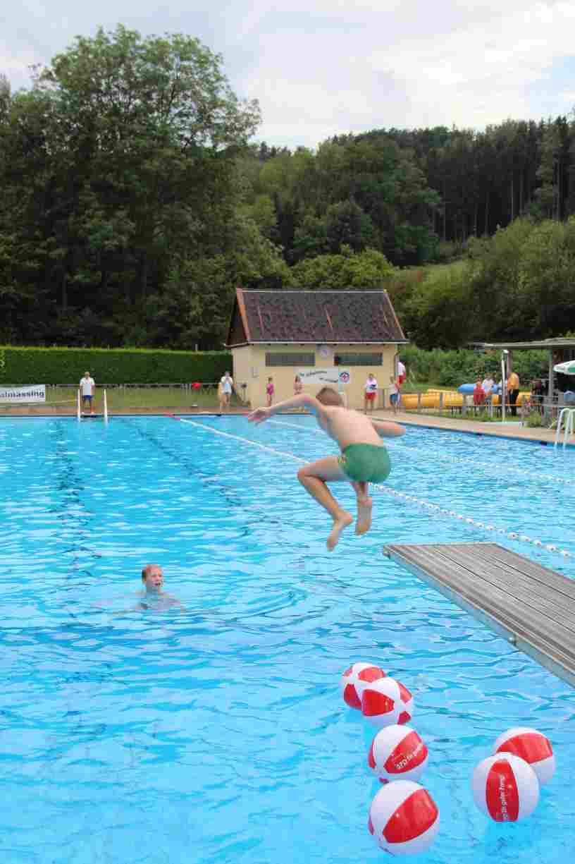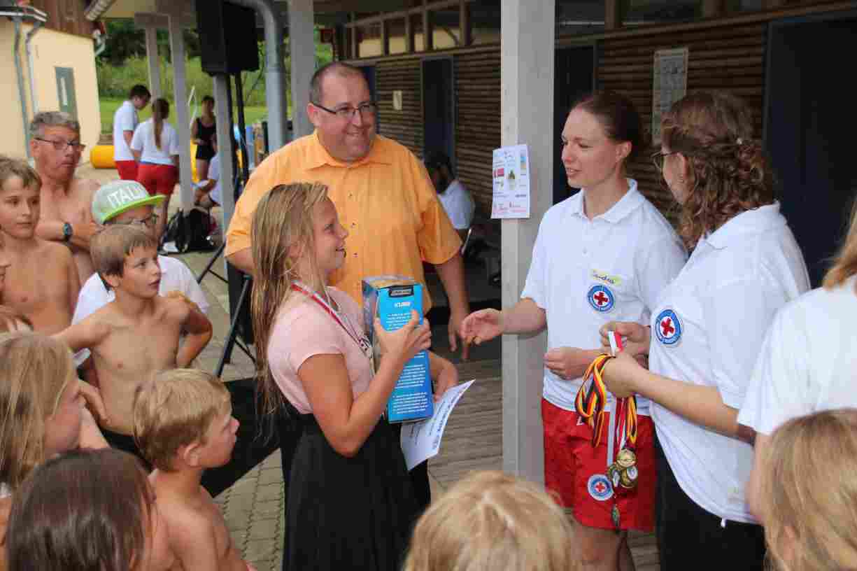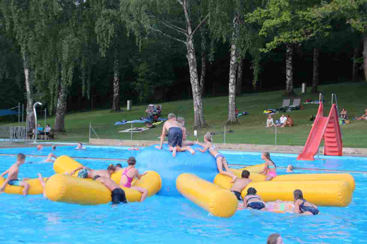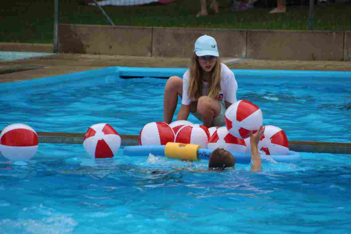 Das erste Badfest mit neuem Konzept wurde mit herrlichem Sommerwetter und einer wahren Besucherschar belohnt. An 9 Spielestationen für Schwimmer und 3 Stationen für Nichtschwimmer gab es zwei Stunden lang allerlei Trubel. Etwa 110 Teilnehmer wagten sich an die Aufgaben. Dabei galt es, beim Sprint Schnelligkeit und beim Balance-Labyrinth Geschicklichkeit zu beweisen. Ein gutes Auge war auch beim Kegeln mit Tauchringen gefragt. Alles Tarieren half beim Frisbee-Zielwerfen manchmal nichts, denn es dauert einige Würfe, bis man den Bogen raus hat. Einige Naturtalente haben wir auch entdeckt: Beim Luftmatratzen-Wettrennen wart ihr nicht nur schnell, sondern auch mit teils perfekter Paddeltechnik am Werk. Mit unkonventioneller Ausrüstung gings bei der Würfelstaffel ins Wasser: Möglichst schnell musste ein Dreierteam eine Warnweste, Schwimmkappe, Flipflops und ein Paar Putzhandschuhe anziehen – schwierig nur, dass das Würfelglück entschied, wann es weitergehen durfte. Um pure Kraft ging es beim Bierfässla-Weitwurf. Die konnte auch bei der neuen Tauchdisziplin nicht schaden: In 30 Sekunden musste eine versenkte Mülltonne unter Wasser möglichst weit geschoben werden. Scheinbar leicht erschien dagegen die Aufgabe, Wasserbälle zu transportieren – wären es nicht 10 für 2 Arme gewesen 🙂