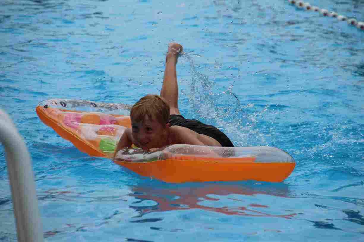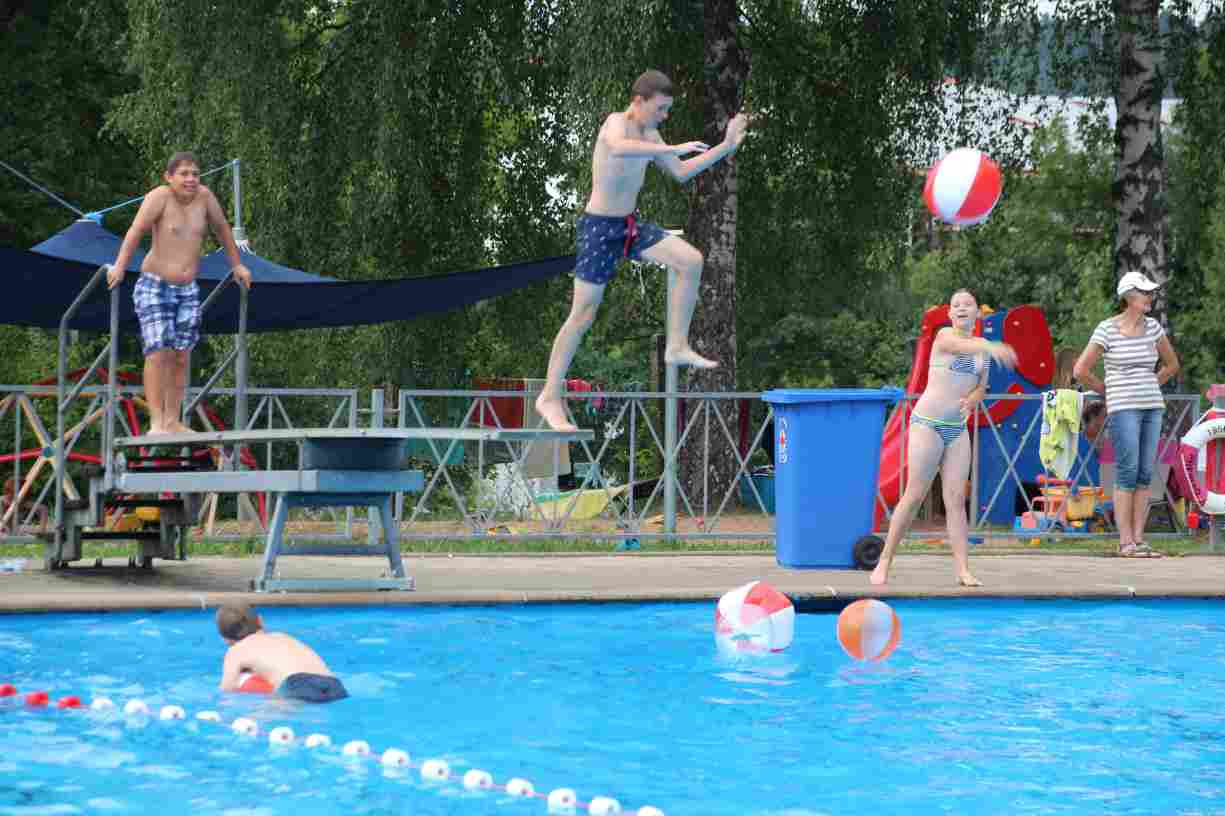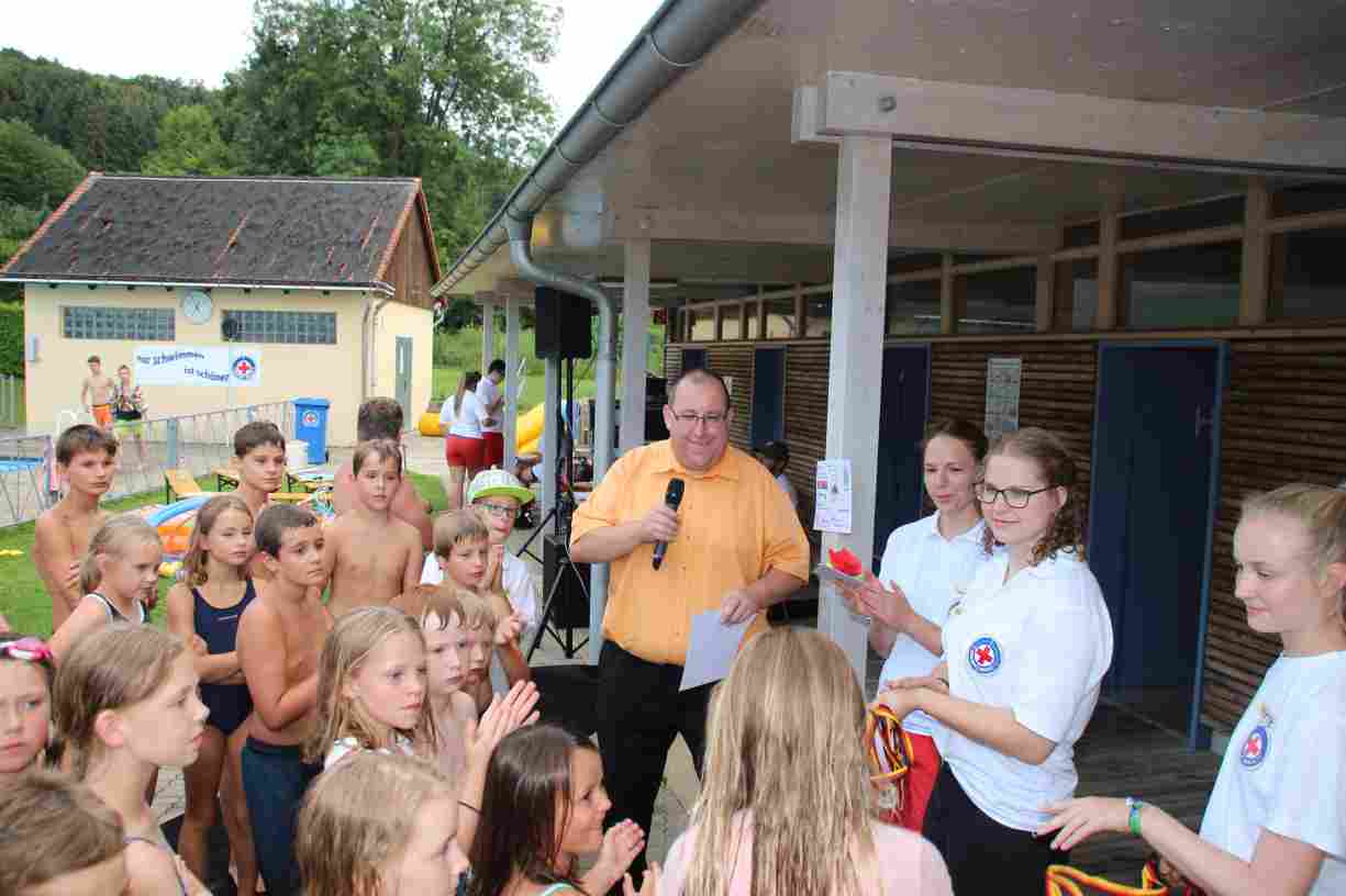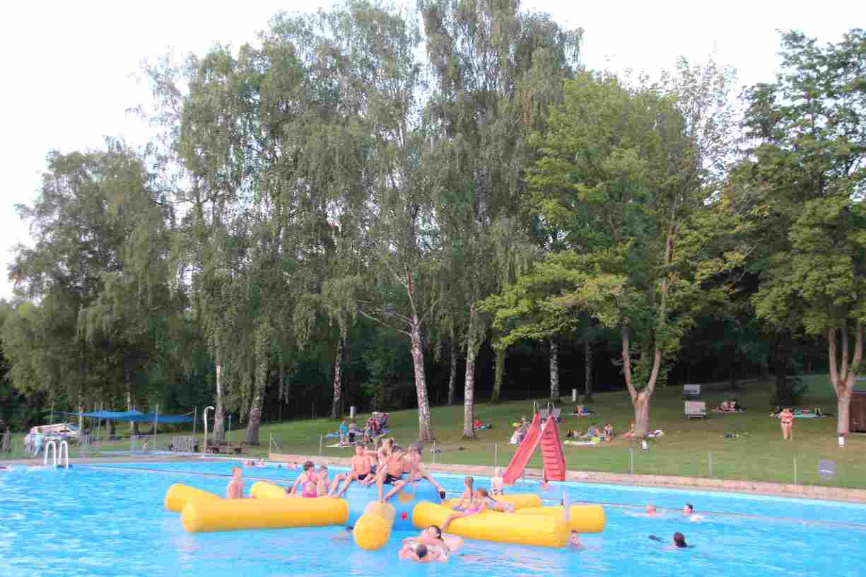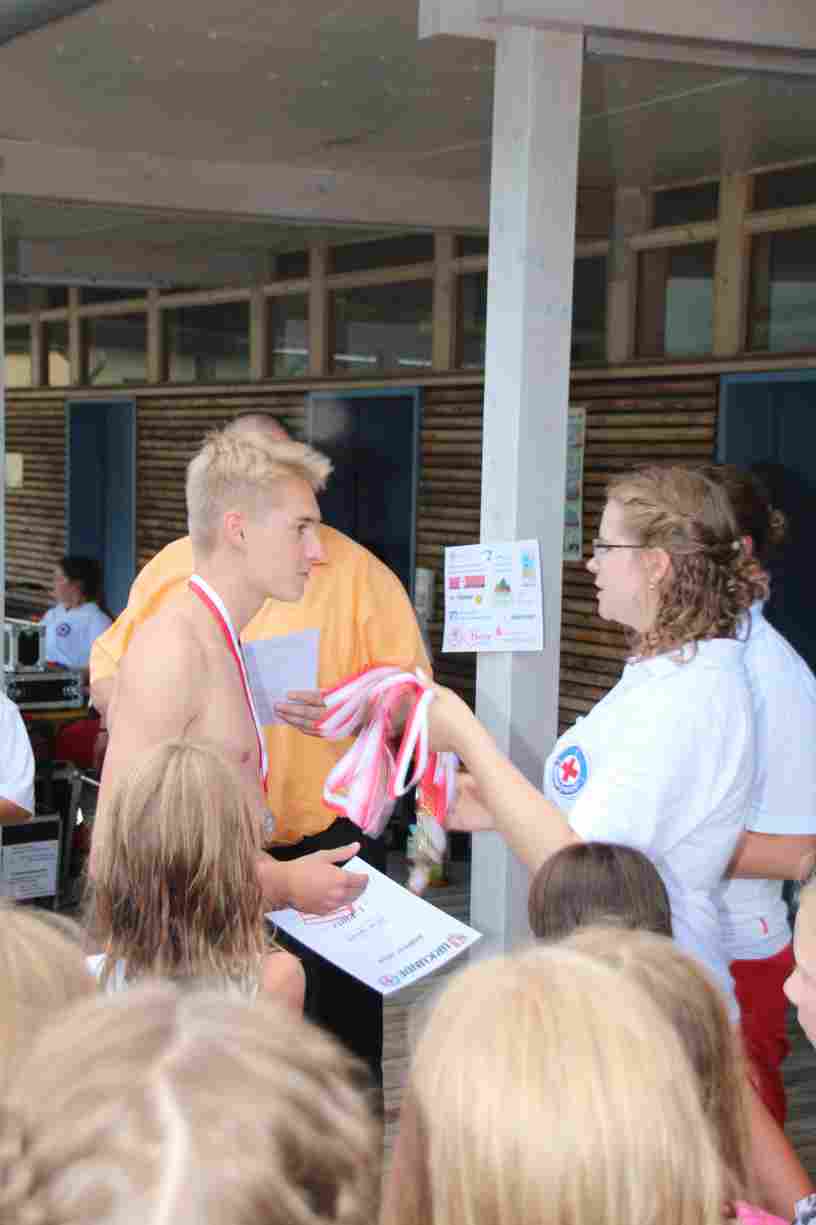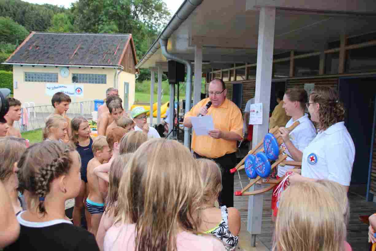 Das erste Badfest mit neuem Konzept wurde mit herrlichem Sommerwetter und einer wahren Besucherschar belohnt. An 9 Spielestationen für Schwimmer und 3 Stationen für Nichtschwimmer gab es zwei Stunden lang allerlei Trubel. Etwa 110 Teilnehmer wagten sich an die Aufgaben. Dabei galt es, beim Sprint Schnelligkeit und beim Balance-Labyrinth Geschicklichkeit zu beweisen. Ein gutes Auge war auch beim Kegeln mit Tauchringen gefragt. Alles Tarieren half beim Frisbee-Zielwerfen manchmal nichts, denn es dauert einige Würfe, bis man den Bogen raus hat. Einige Naturtalente haben wir auch entdeckt: Beim Luftmatratzen-Wettrennen wart ihr nicht nur schnell, sondern auch mit teils perfekter Paddeltechnik am Werk. Mit unkonventioneller Ausrüstung gings bei der Würfelstaffel ins Wasser: Möglichst schnell musste ein Dreierteam eine Warnweste, Schwimmkappe, Flipflops und ein Paar Putzhandschuhe anziehen – schwierig nur, dass das Würfelglück entschied, wann es weitergehen durfte. Um pure Kraft ging es beim Bierfässla-Weitwurf. Die konnte auch bei der neuen Tauchdisziplin nicht schaden: In 30 Sekunden musste eine versenkte Mülltonne unter Wasser möglichst weit geschoben werden. Scheinbar leicht erschien dagegen die Aufgabe, Wasserbälle zu transportieren – wären es nicht 10 für 2 Arme gewesen 🙂