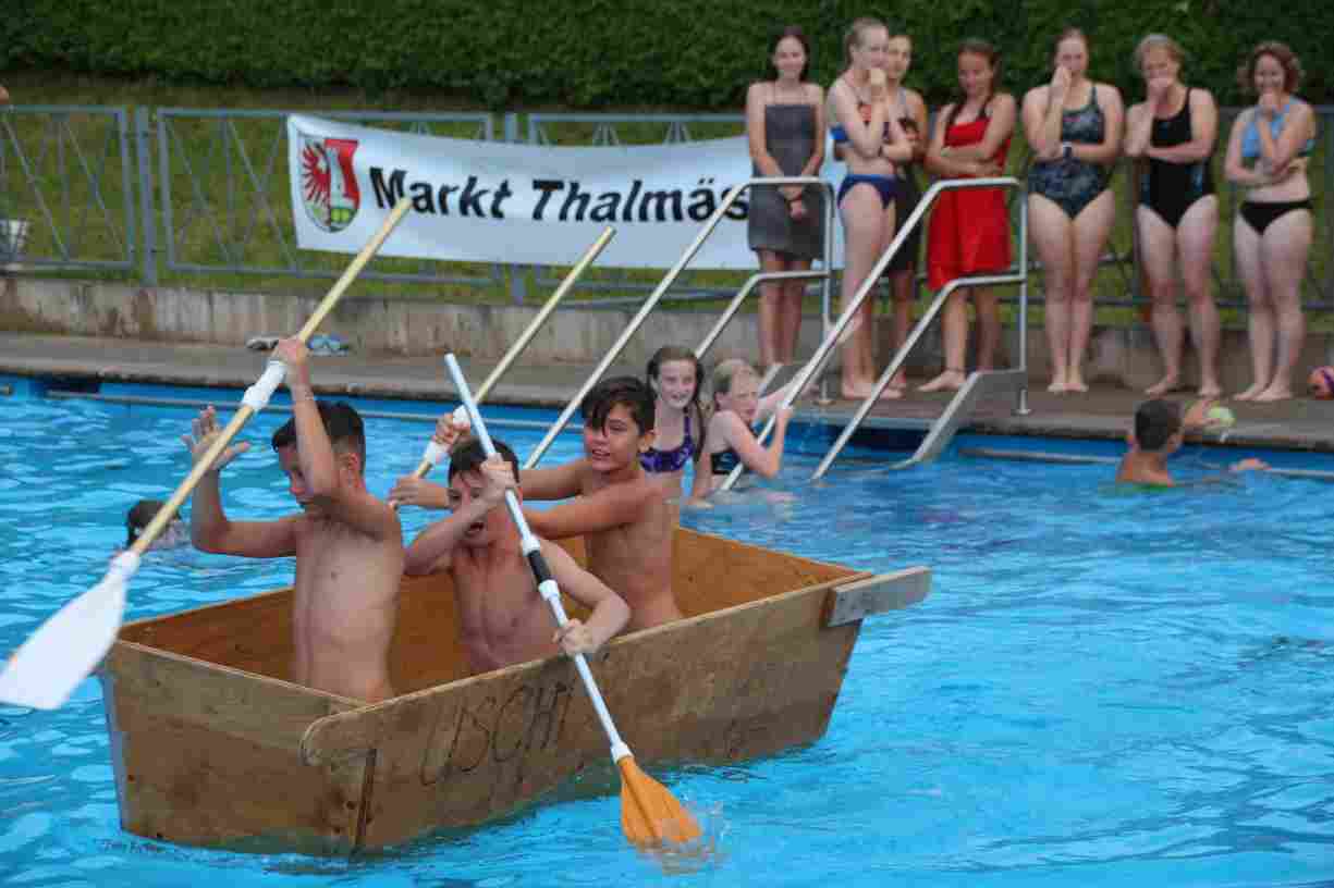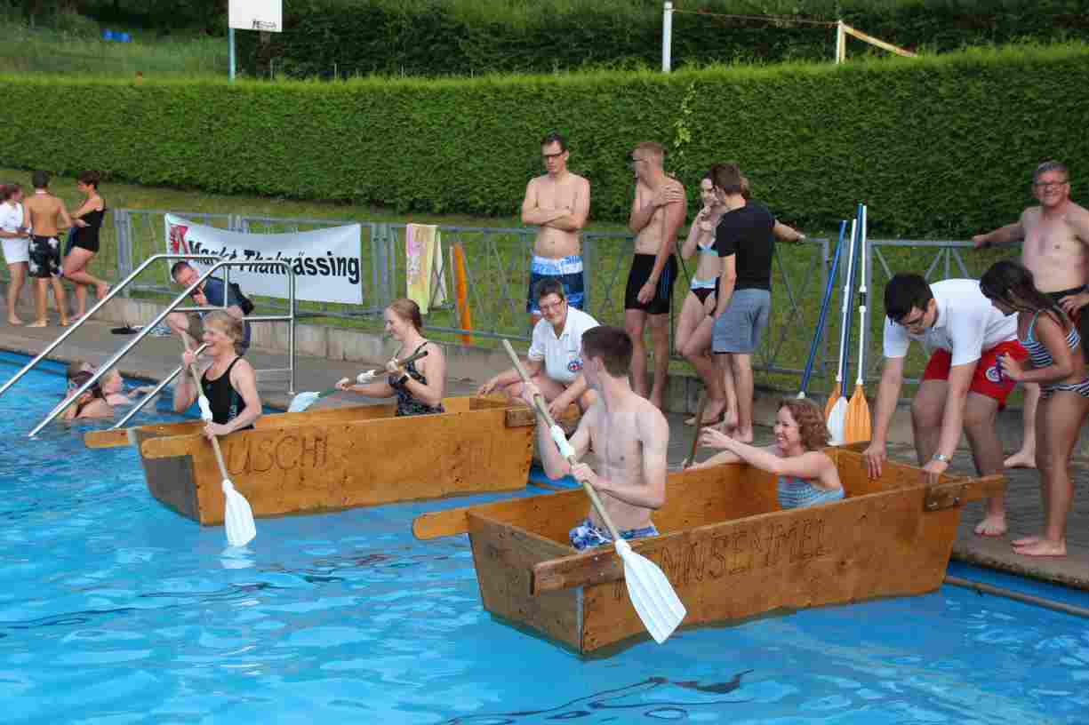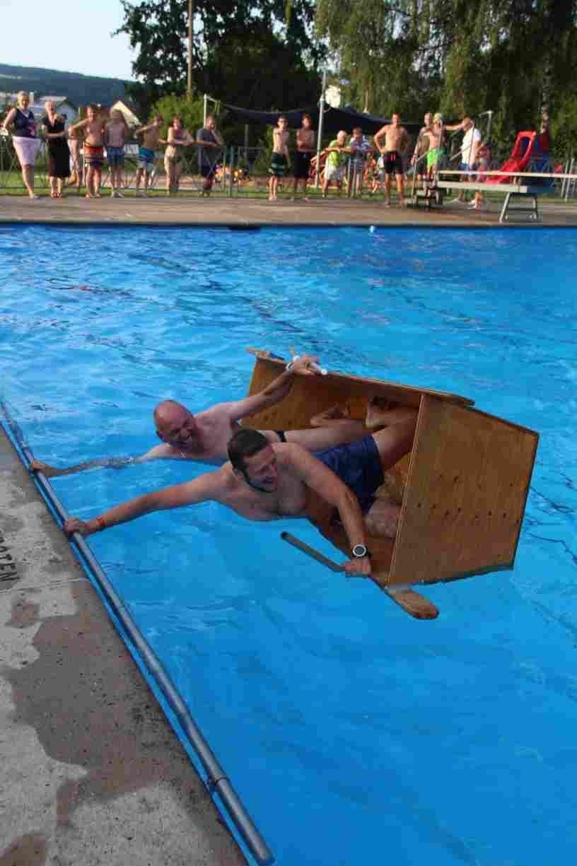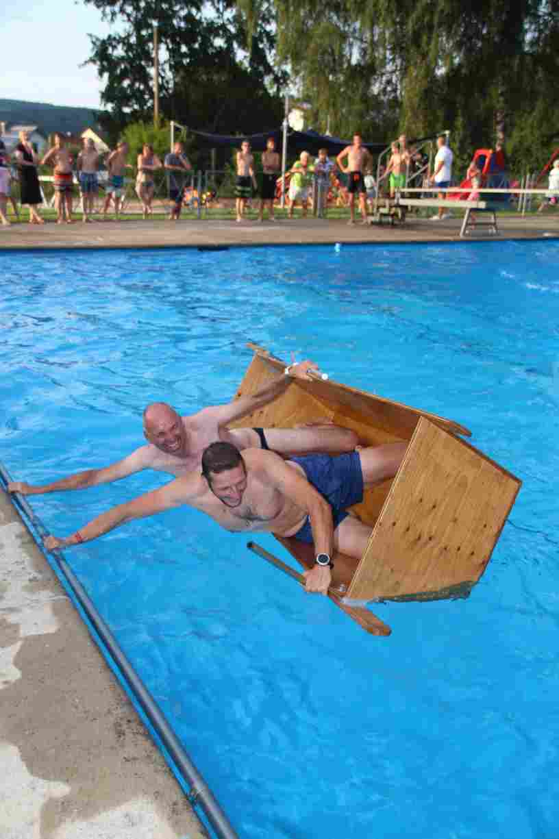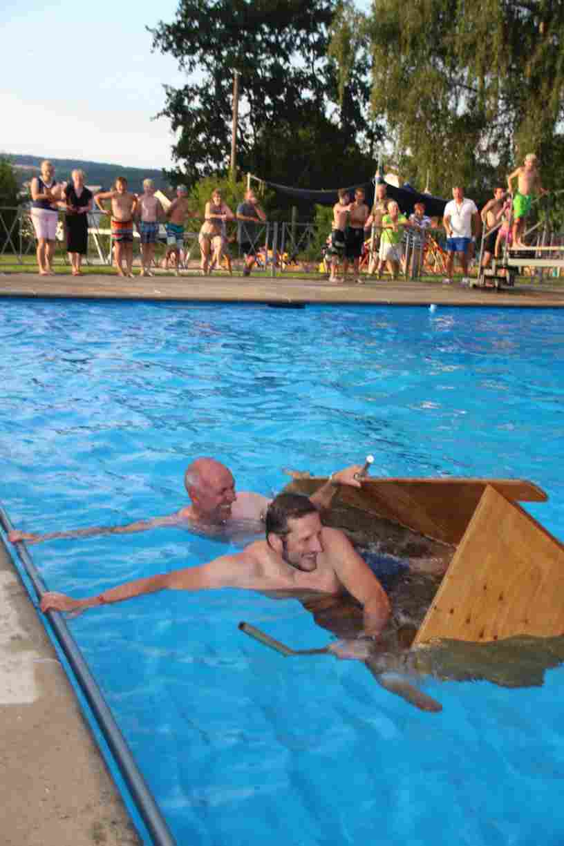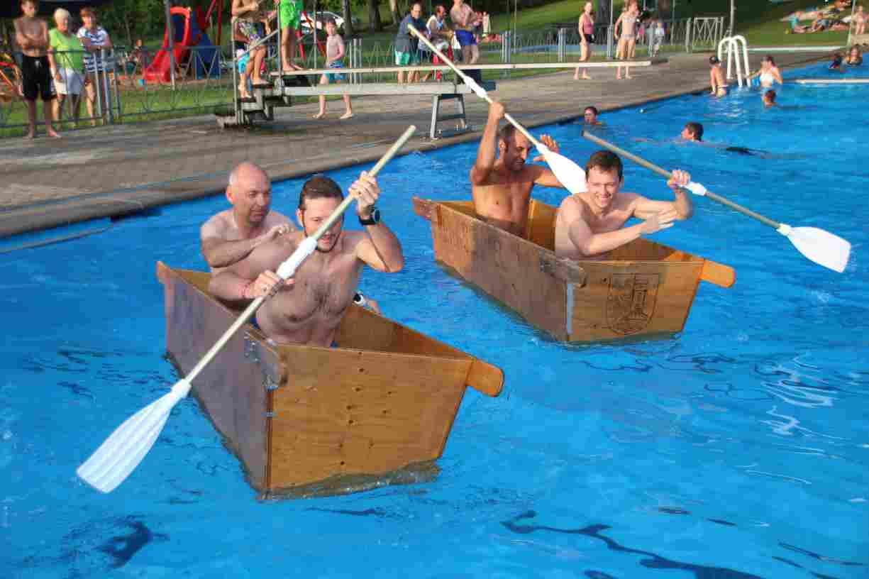 Natürlich durften auch ein paar Klassiker nicht fehlen: Beim Wurstdosentauchen erbeuteten alle 61 Teilnehmer allerlei Leckereien aus der Tiefe. Und fast ebenso viele tollkühne Paddler kämpften beim abschließenden Sautrogrennen der Marktgemeinde um den Titel.