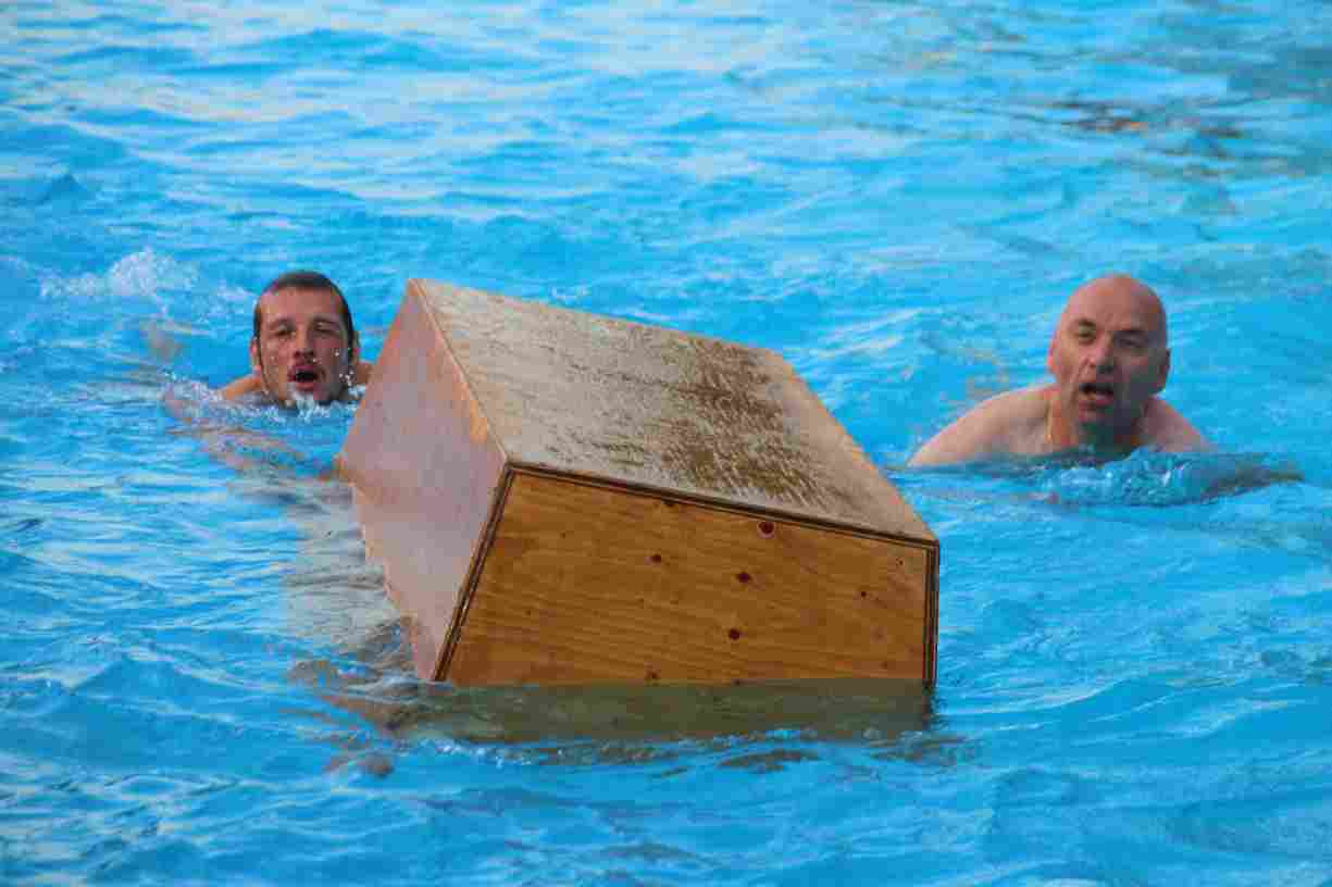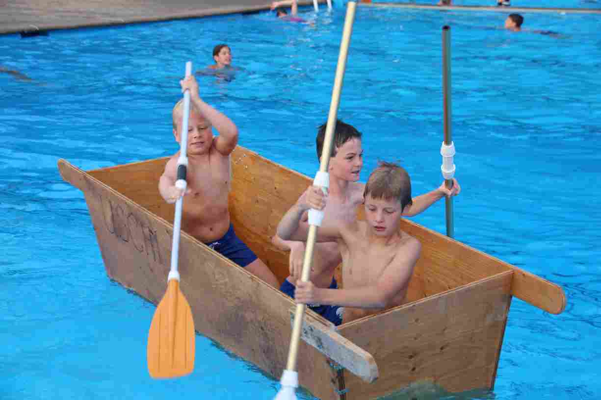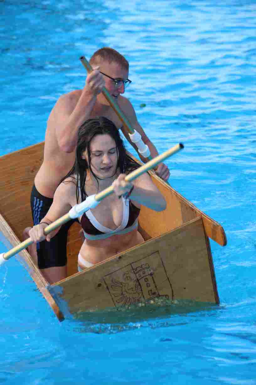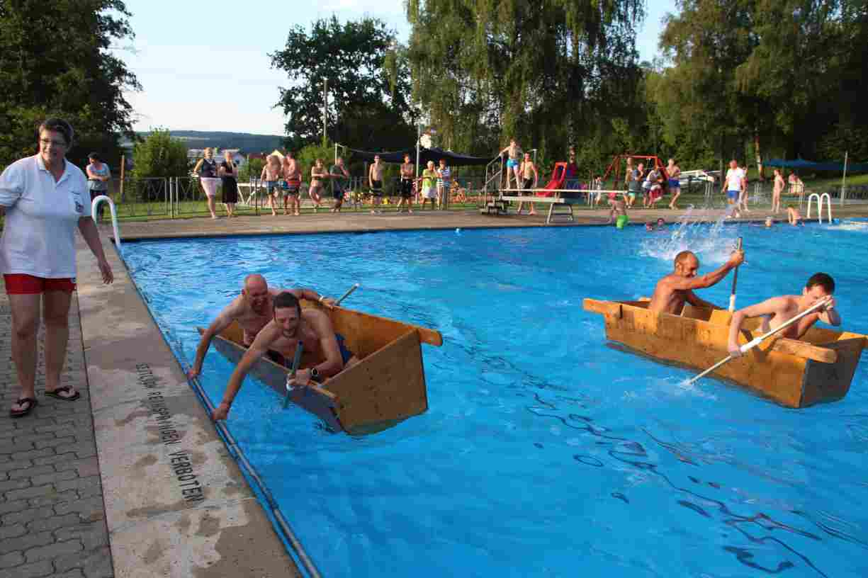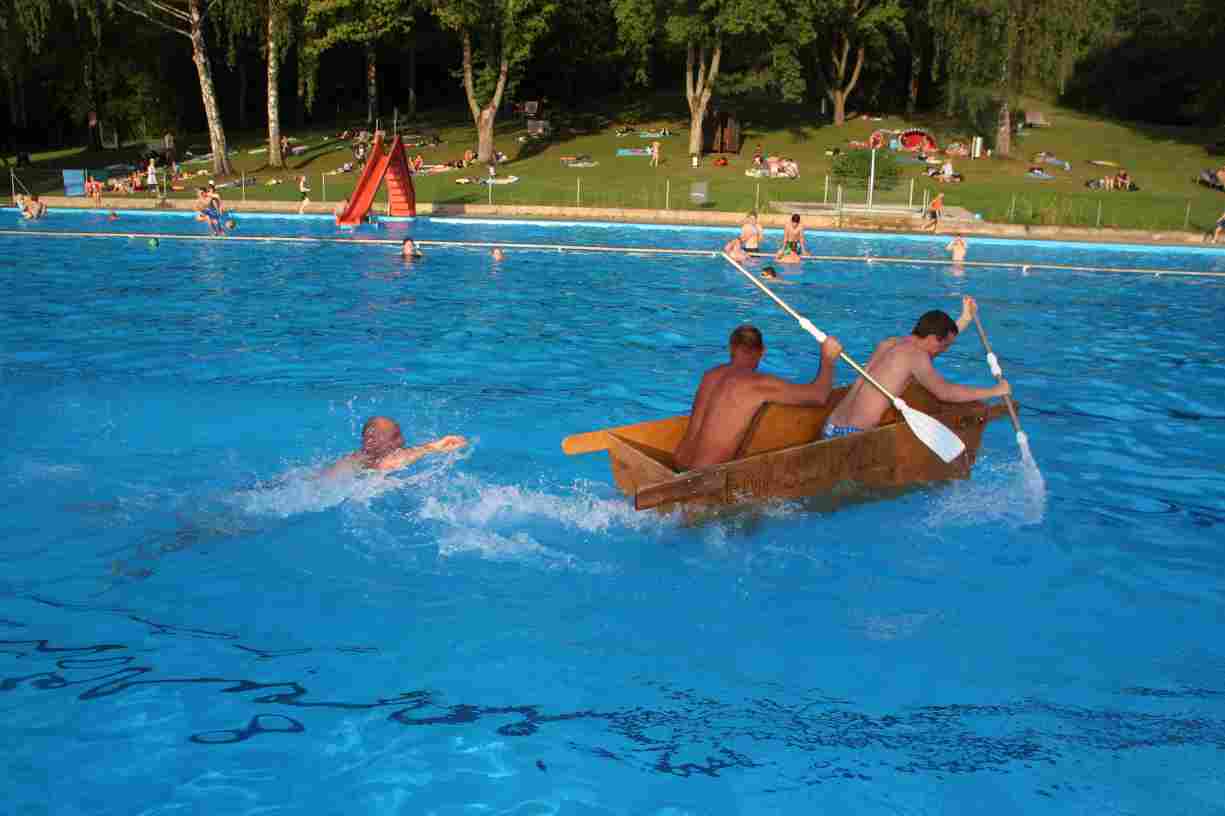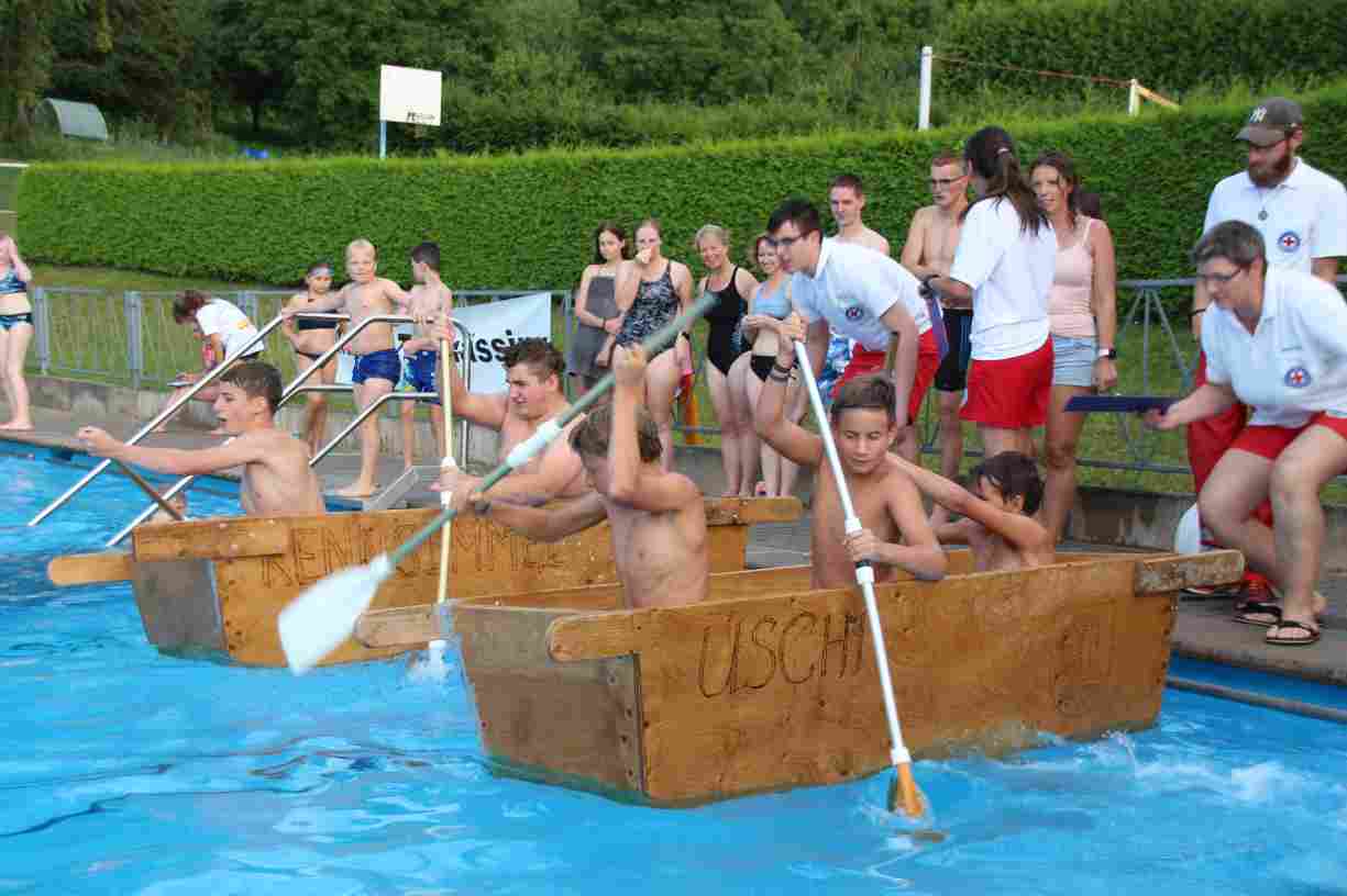 Natürlich durften auch ein paar Klassiker nicht fehlen: Beim Wurstdosentauchen erbeuteten alle 61 Teilnehmer allerlei Leckereien aus der Tiefe. Und fast ebenso viele tollkühne Paddler kämpften beim abschließenden Sautrogrennen der Marktgemeinde um den Titel.